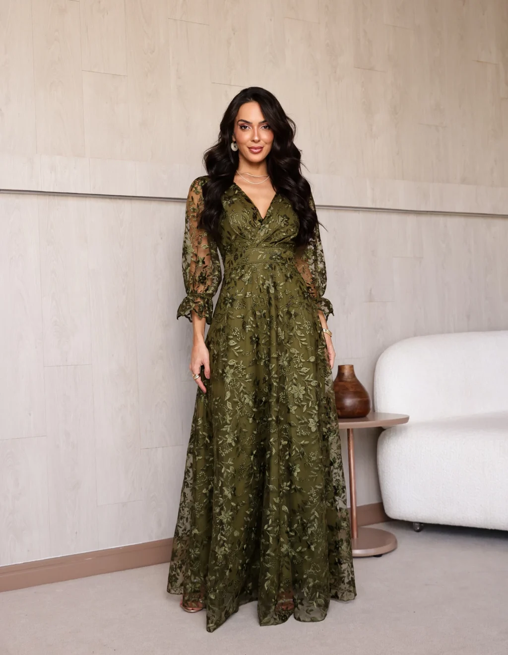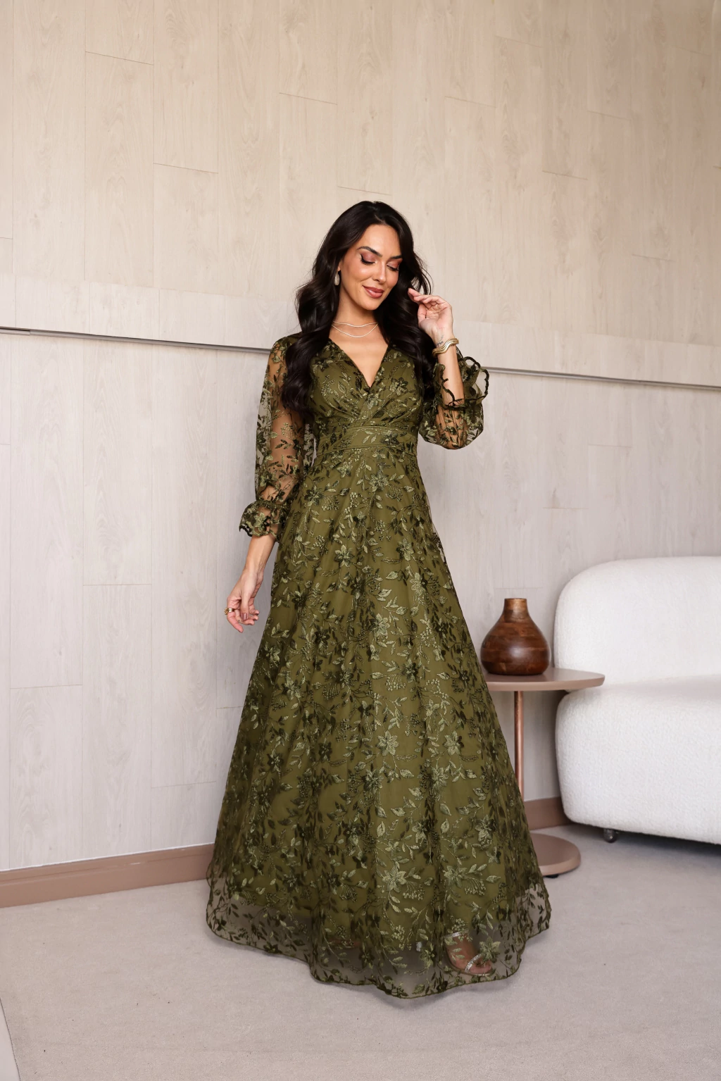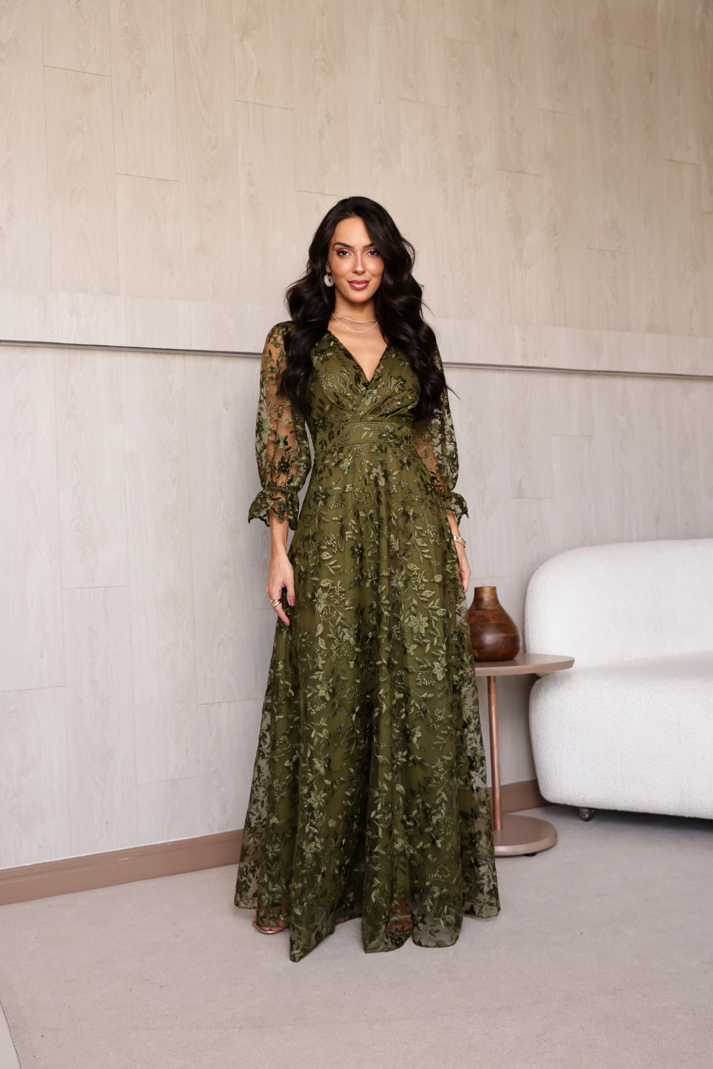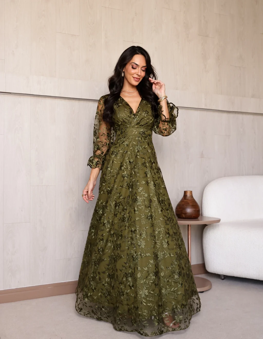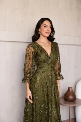 Vestido Alice Verde Oliva de Festa para Madrinhas mãe do Noivo