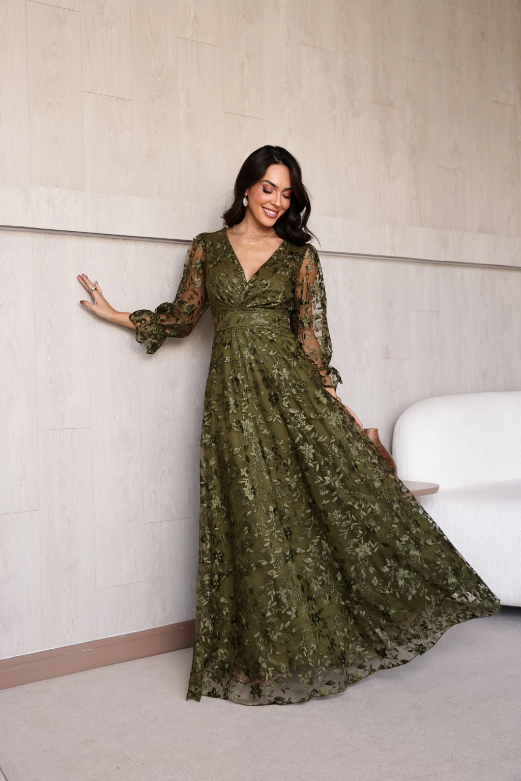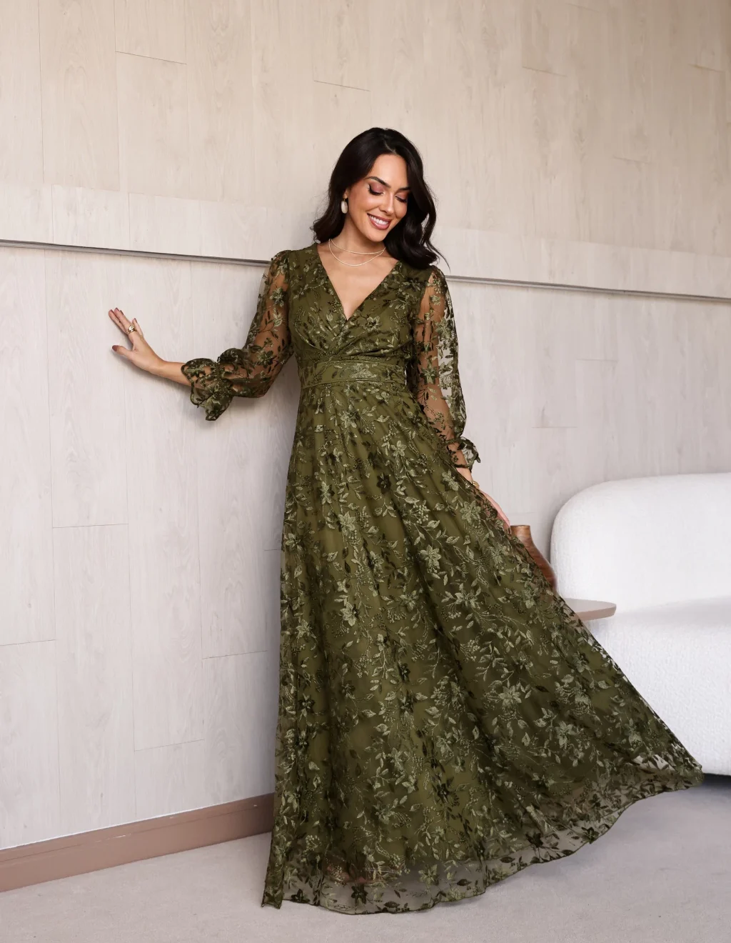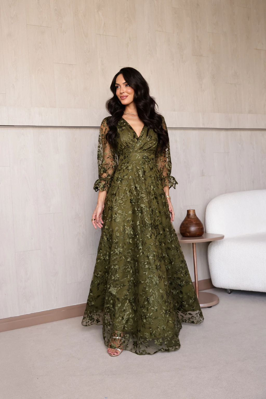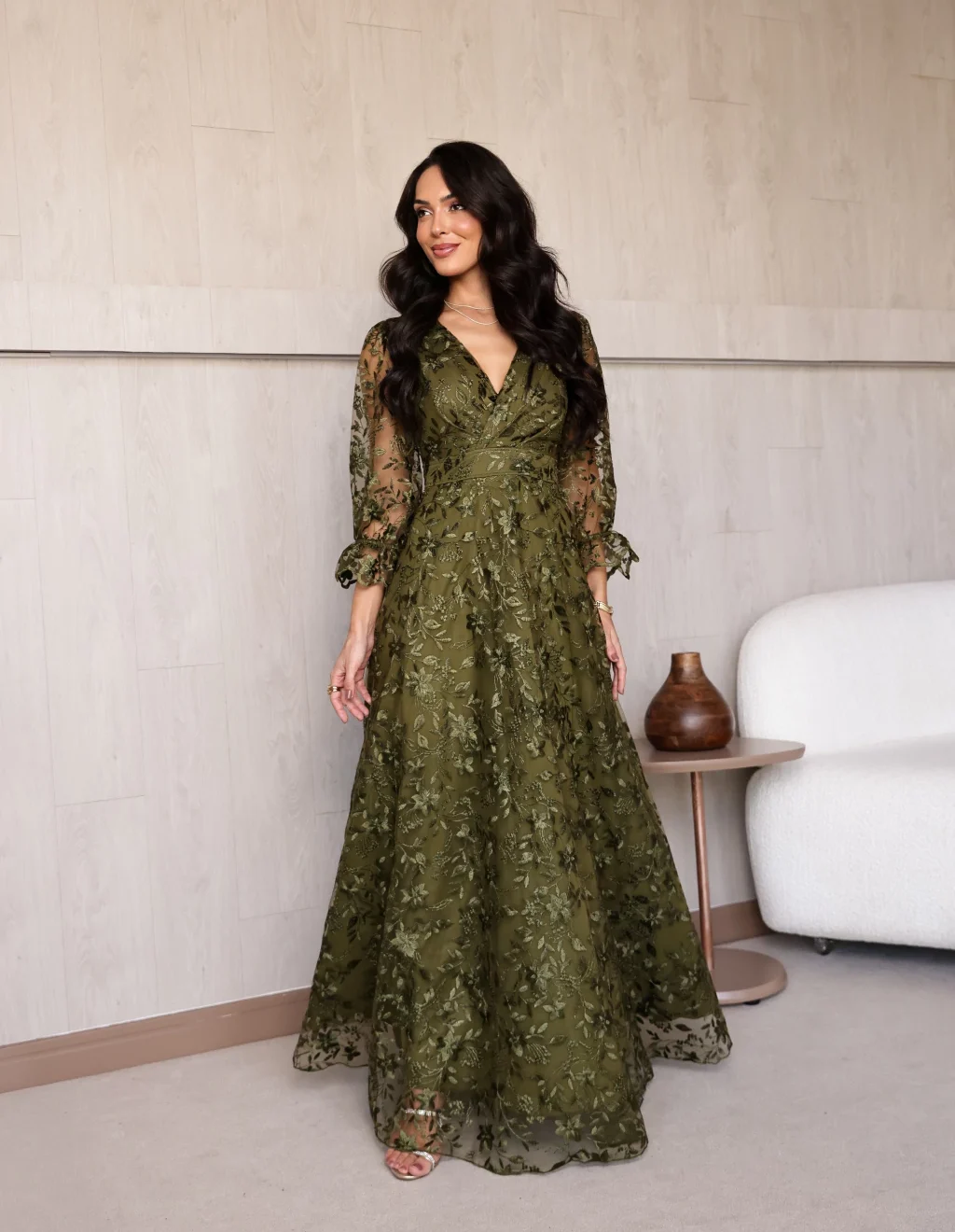 Vestido Alice Verde Oliva de Festa para Madrinhas mãe do Noivo