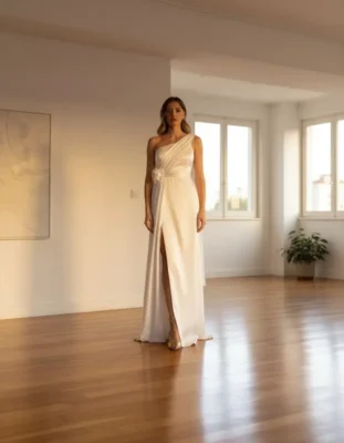 O Vestido Aurora di Luce é a tradução do glamour moderno. Seu design de um ombro só com capa longa que se estende até a barra cria um visual encantador e sofisticado, valorizando a silhueta feminina com leveza e estilo.