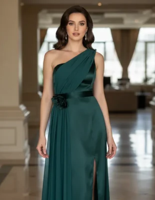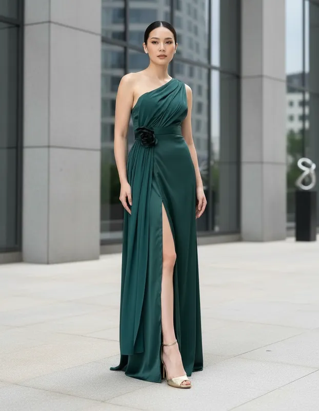 Os vestidos longos de um ombro só com capa criam um design encantador que acompanha a silhueta feminina, destacando toda a beleza da mulher com um visual moderno, elegante e cheio de personalidade.