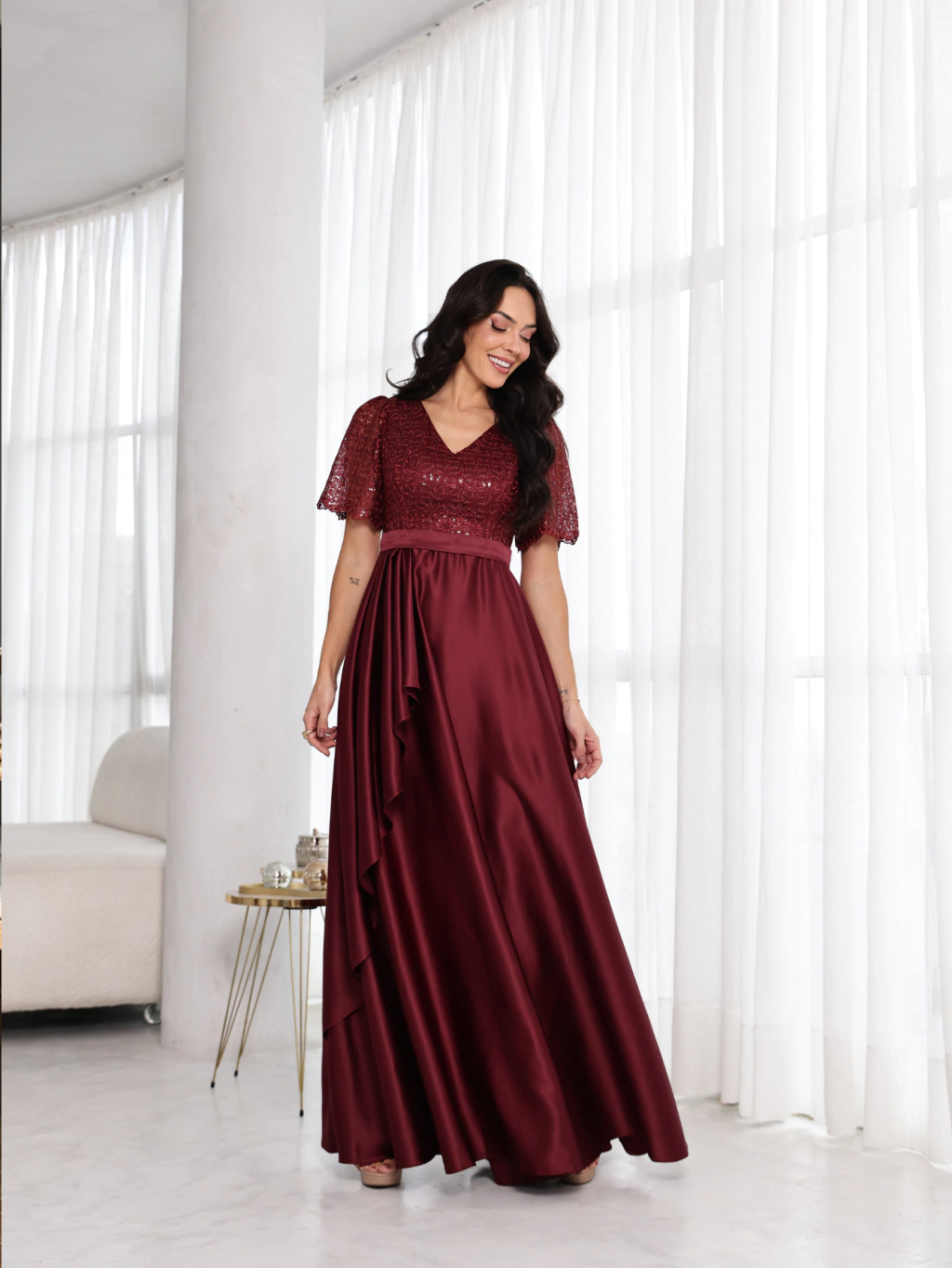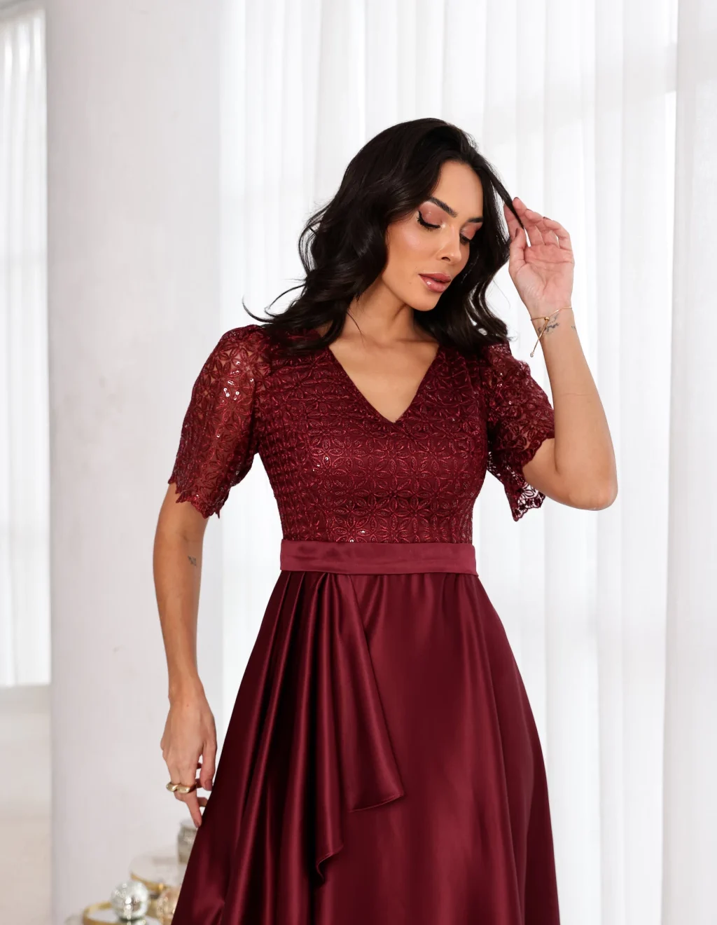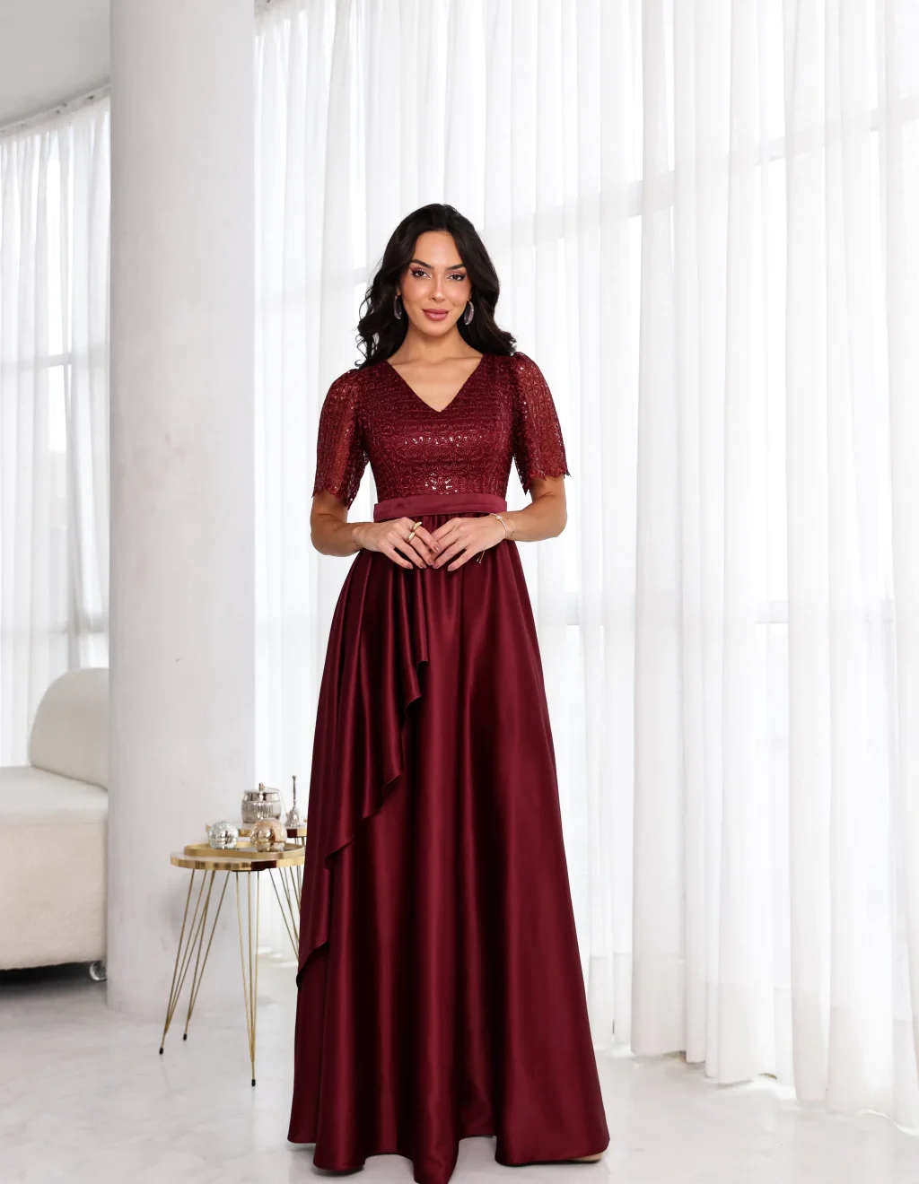 Confeccionada em crepe satin, garante leveza e movimento encantador ao caminhar, criando um efeito marcante e elegante.