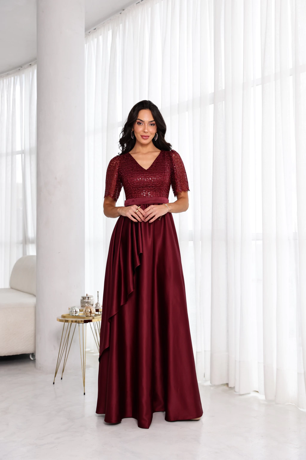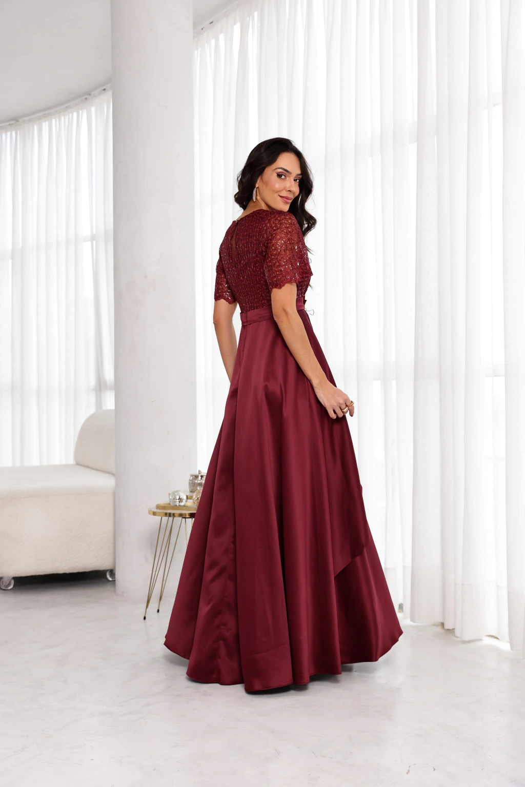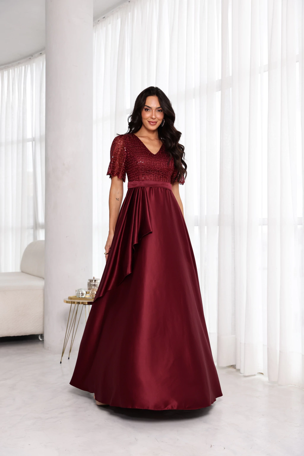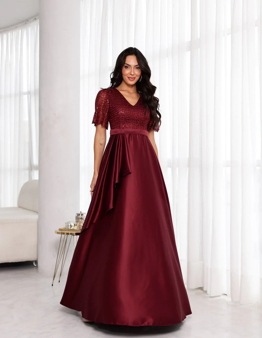Confeccionada em crepe satin, garante leveza e movimento encantador ao caminhar, criando um efeito marcante e elegante.
