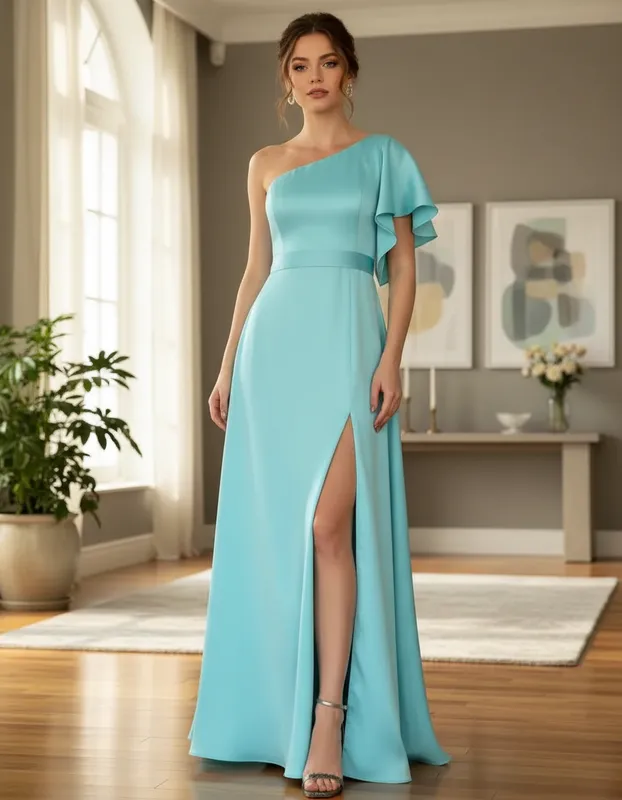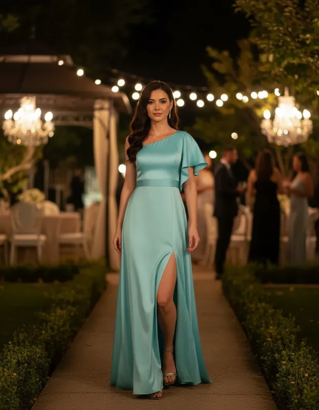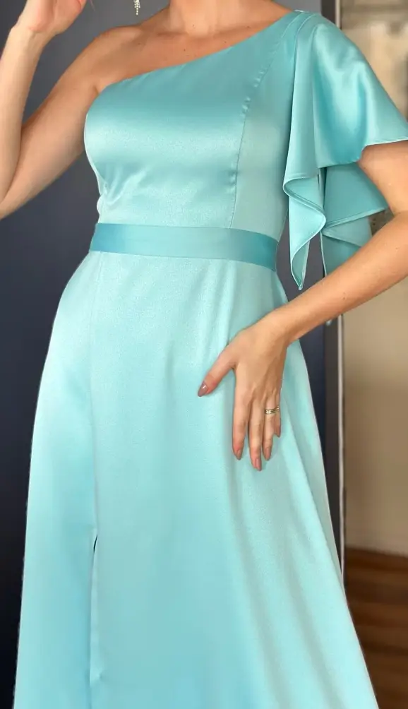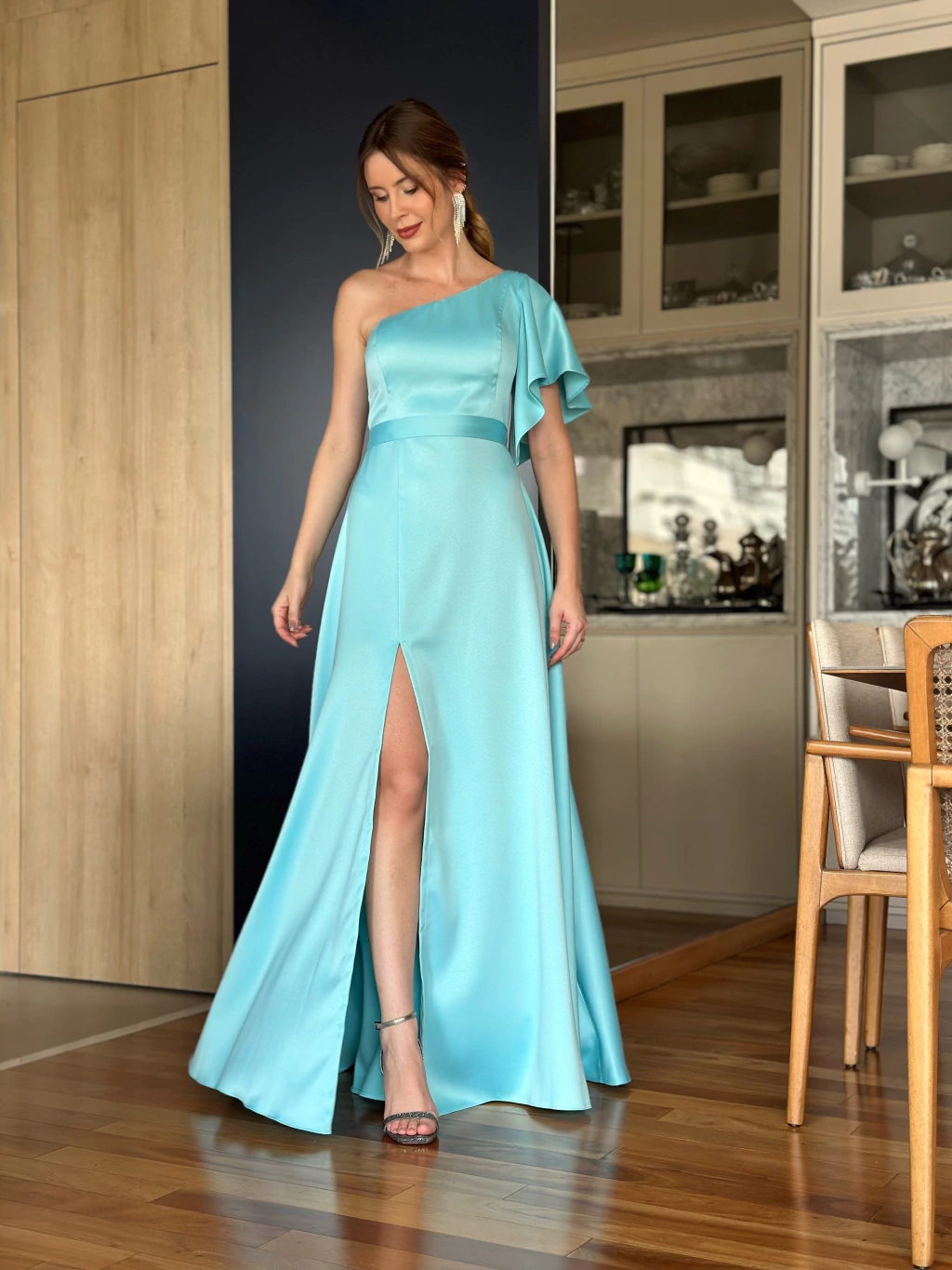 A manga única no lado esquerdo, adornada por babados assimétricos, confere um toque exclusivo, moderno e extremamente chique. Um modelo que exala delicadeza, charme e sofisticação — perfeito para eventos diurnos ou ao entardecer.