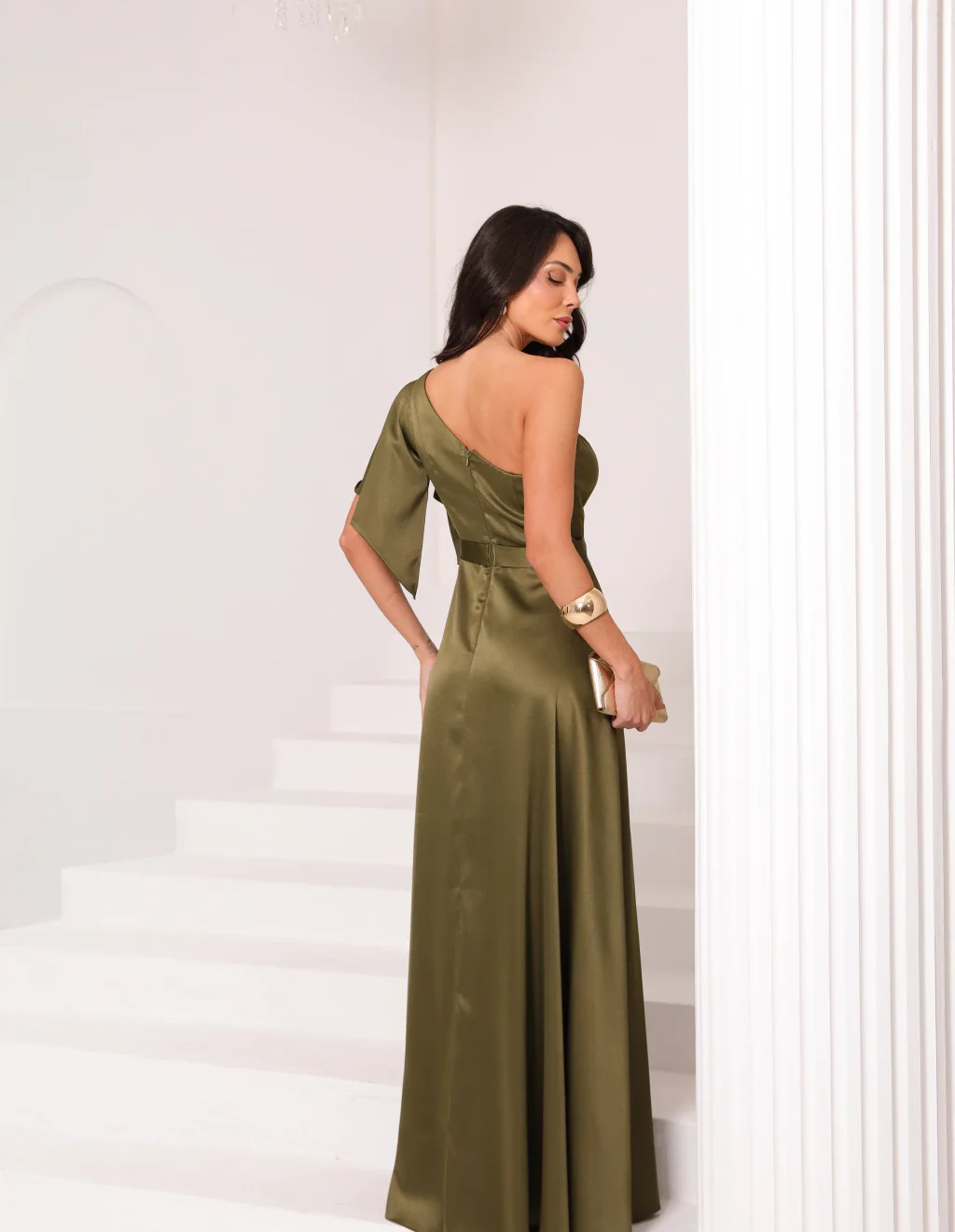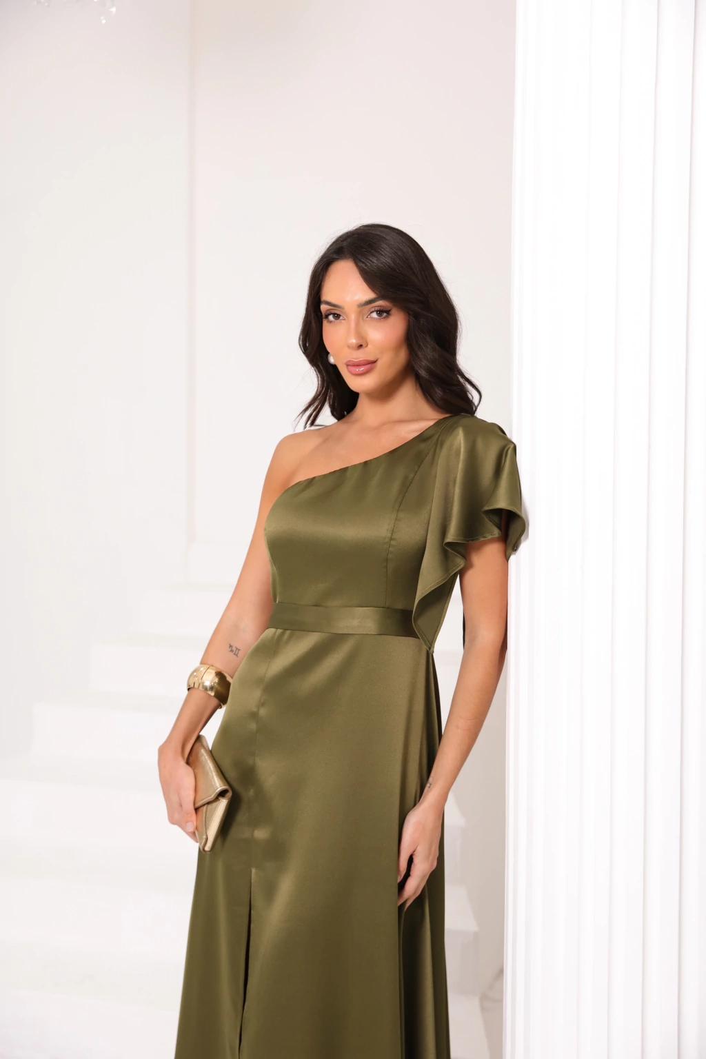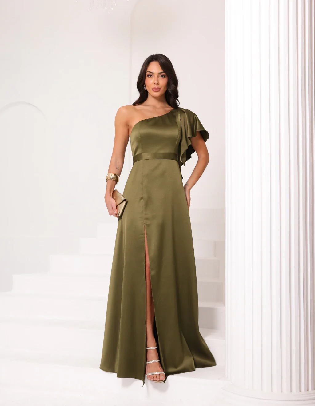 A manga única no lado esquerdo, adornada por babados assimétricos, confere um toque exclusivo, moderno e extremamente chique. Um modelo que exala delicadeza, charme e sofisticação — perfeito para eventos diurnos ou ao entardecer.