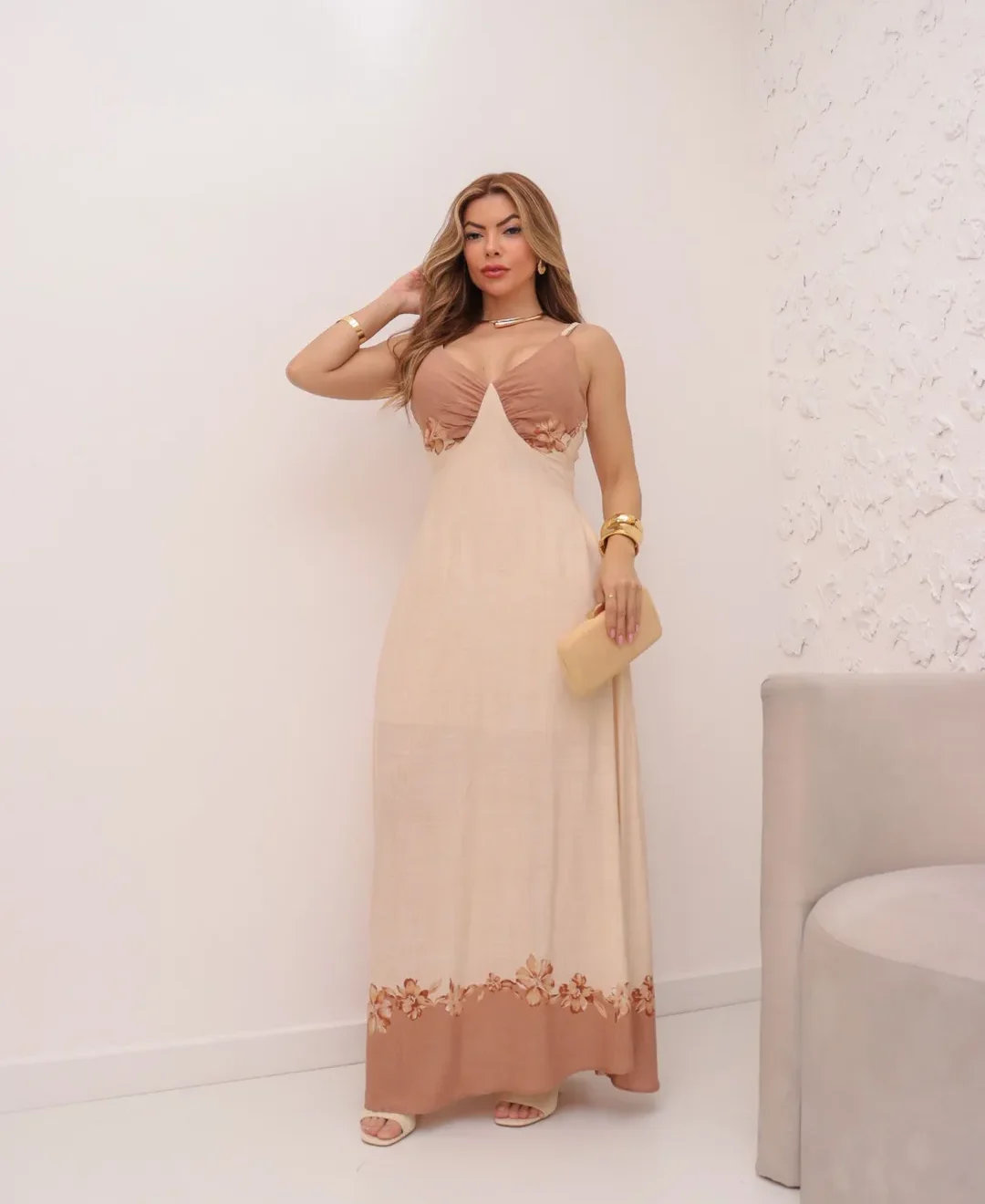 O Vestido Constanza de Festa une delicadeza, conforto e estilo. Confeccionado em viscolinho leve, possui forro e bojo para maior estrutura e caimento perfeito. As alças finas e reguláveis, combinadas com elastex nas costas e amarração ajustável, garantem conforto e ajuste personalizado. Com estampa floral barrada, é ideal para festas, eventos ou ocasiões especiais, trazendo um visual romântico e sofisticado.