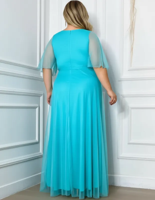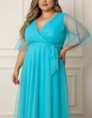 Encante em qualquer ocasião com este vestido longo de festa plus size, confeccionado em tule leve e fluido, que oferece movimento e delicadeza ao look.