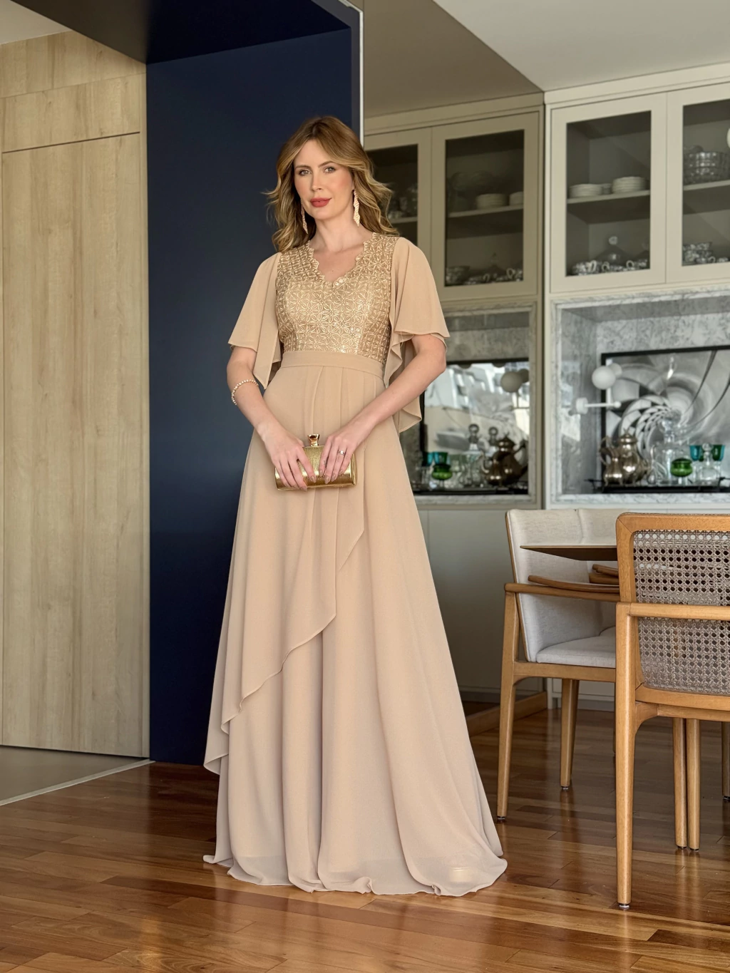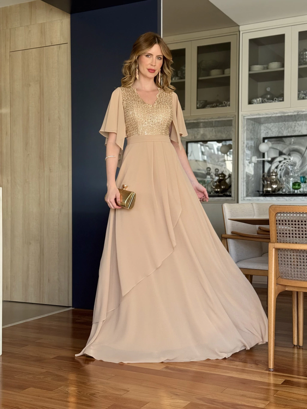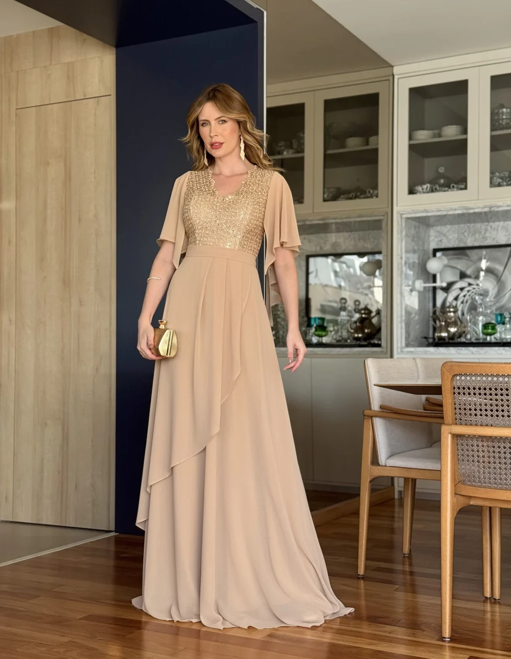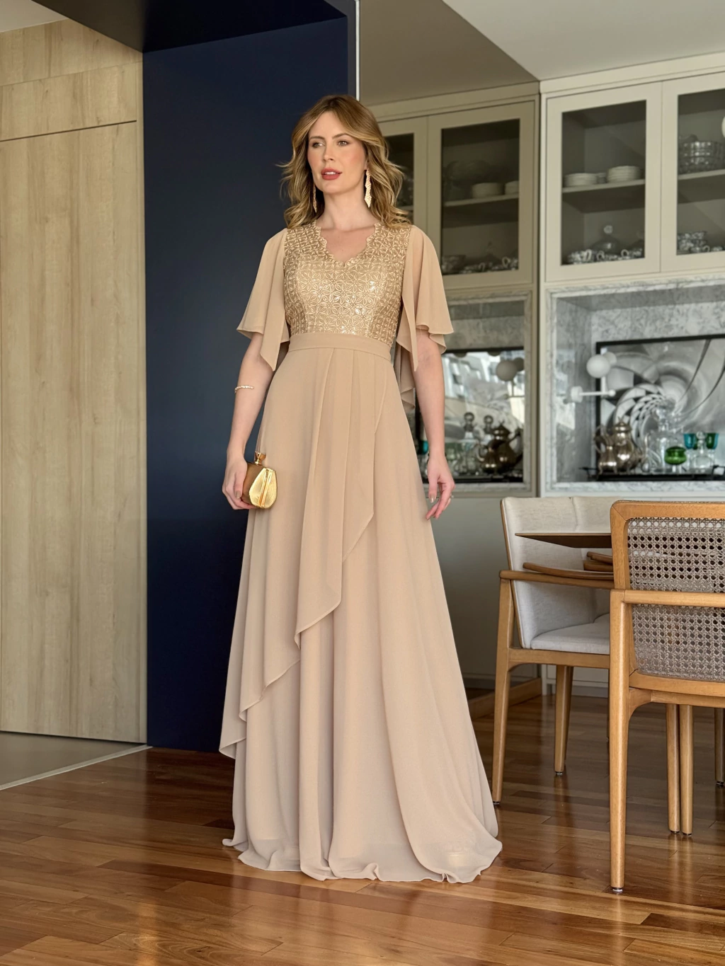 O vestido de festa em chiffon é uma peça clássica, romântica e extremamente elegante. Confeccionado em um tecido leve e fluido, ele proporciona movimento, conforto e sofisticação em qualquer ocasião especial. Sua modelagem traduz delicadeza sem abrir mão do estilo, sendo ideal para quem deseja um visual refinado e atemporal.