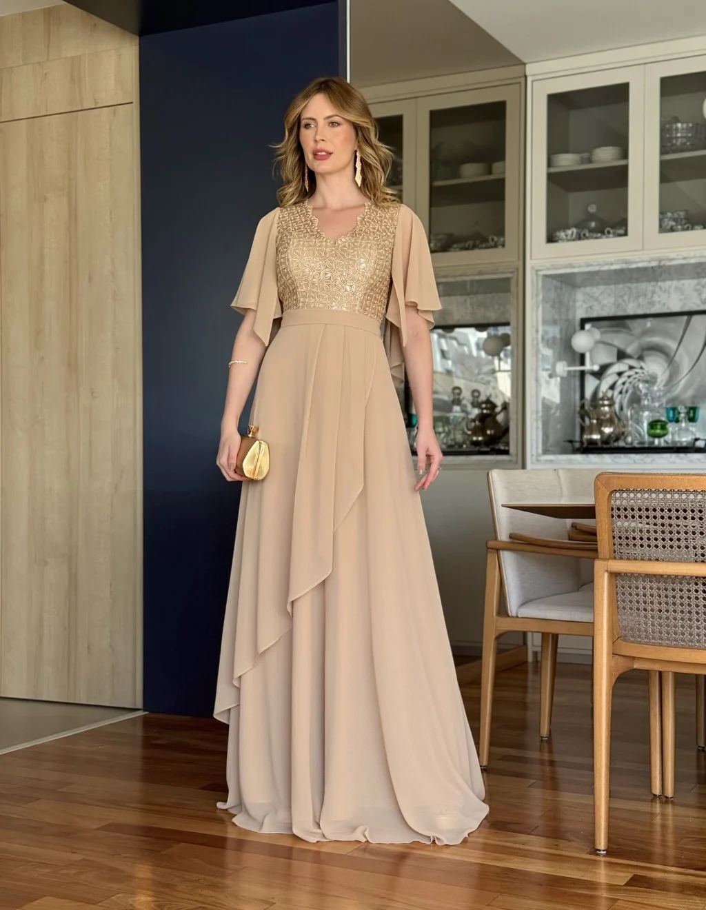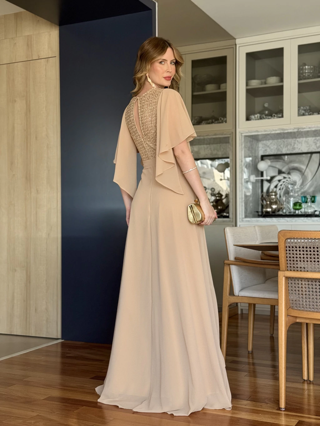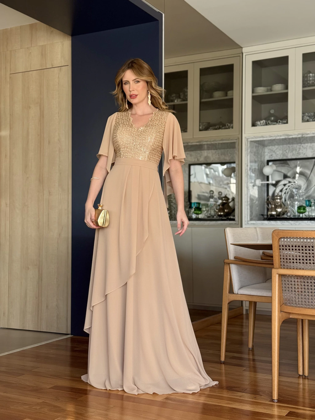 O vestido de festa em chiffon é uma peça clássica, romântica e extremamente elegante. Confeccionado em um tecido leve e fluido, ele proporciona movimento, conforto e sofisticação em qualquer ocasião especial. Sua modelagem traduz delicadeza sem abrir mão do estilo, sendo ideal para quem deseja um visual refinado e atemporal.