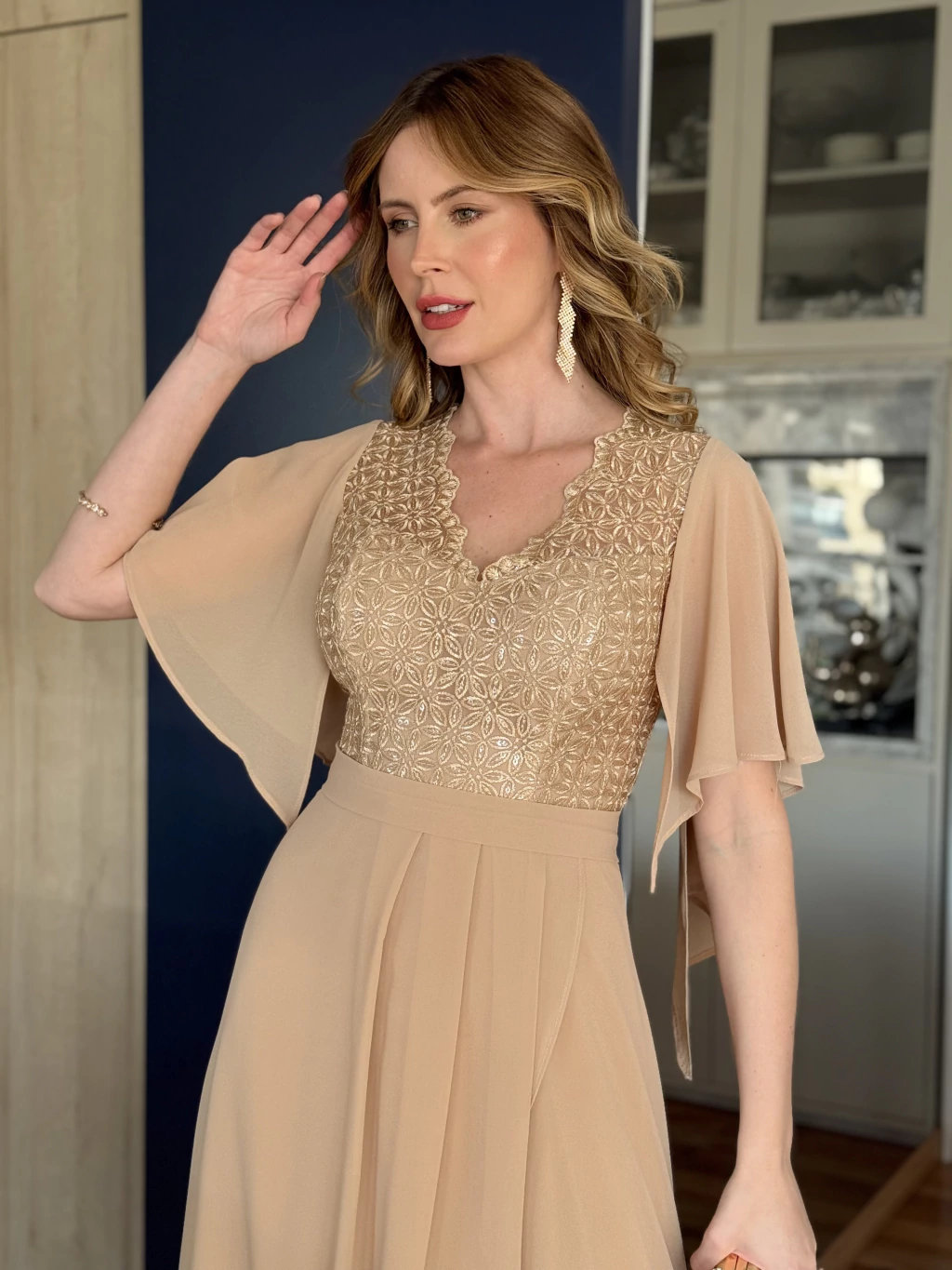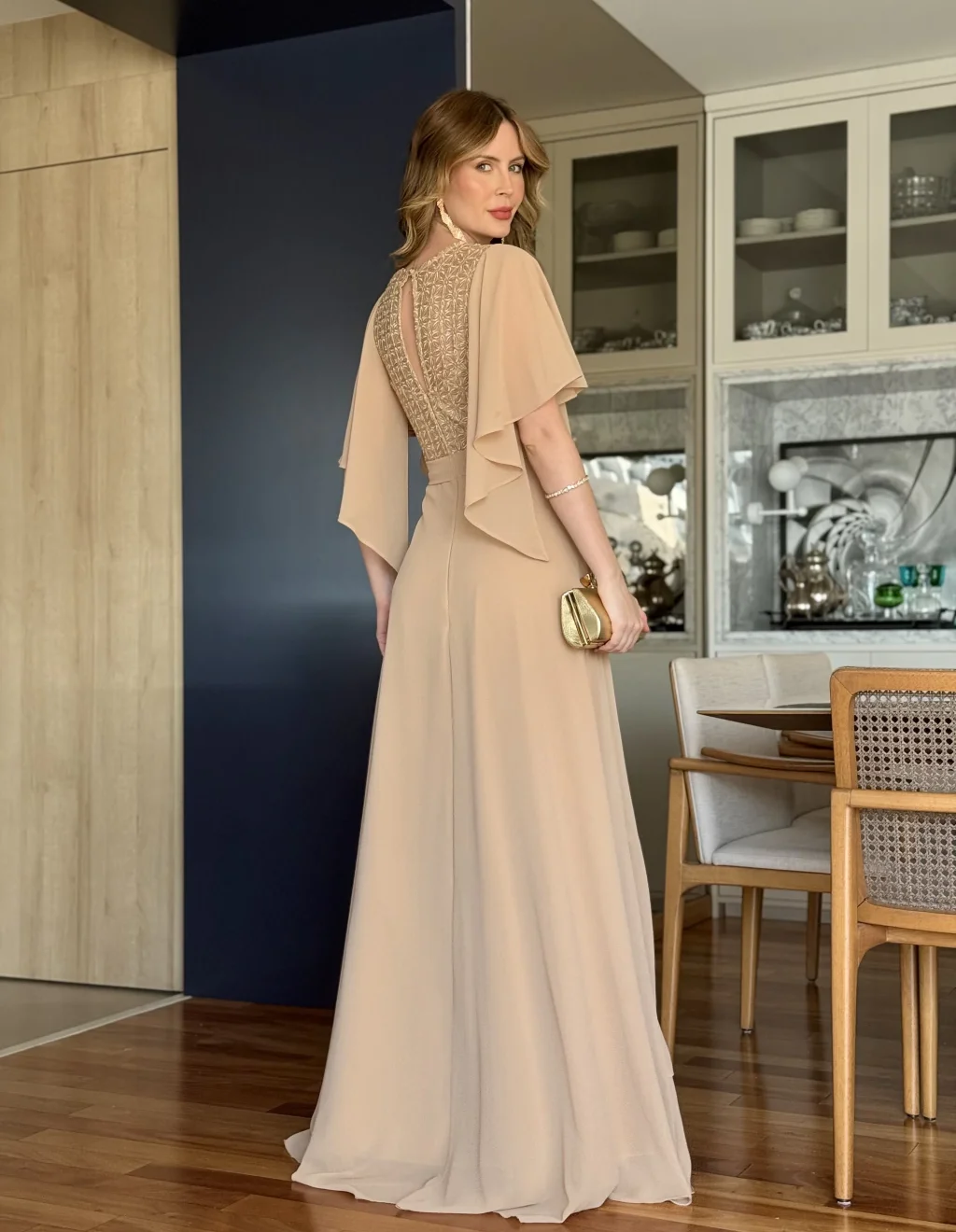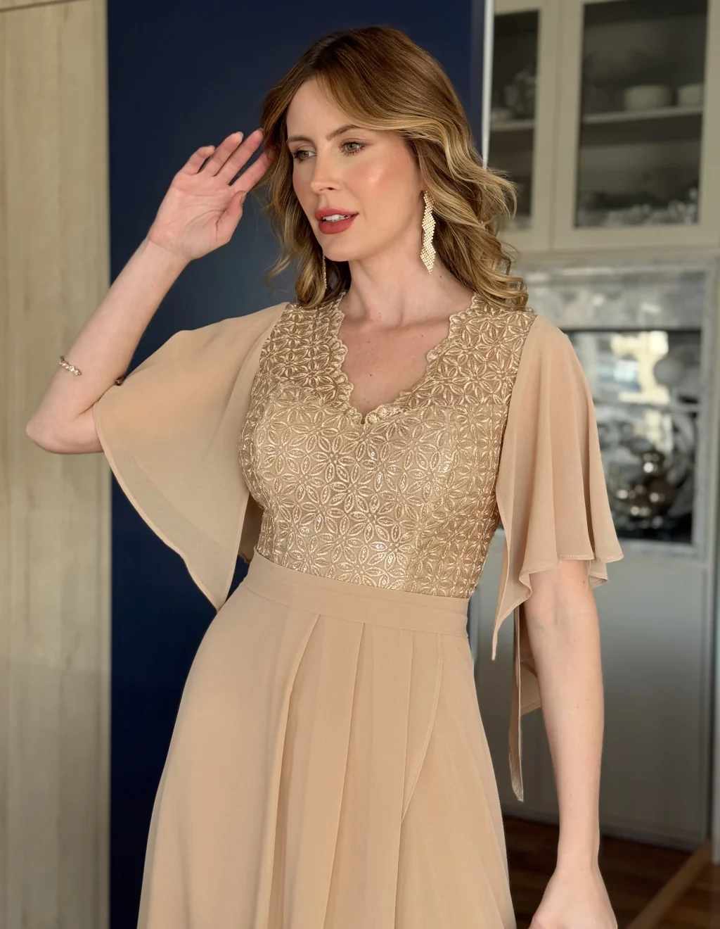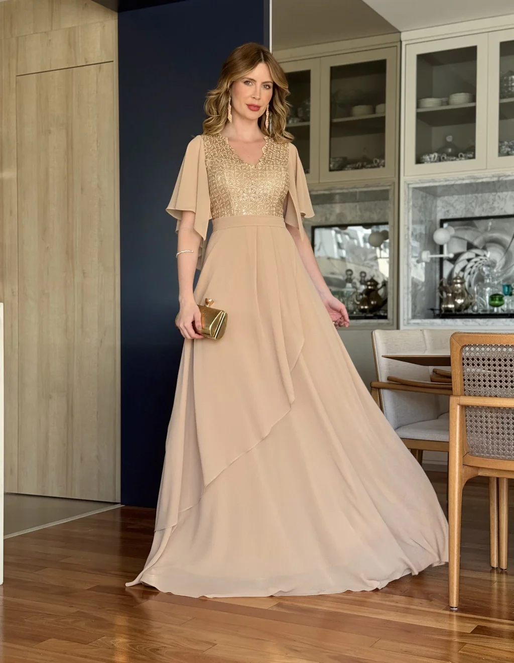 O vestido de festa em chiffon é uma peça clássica, romântica e extremamente elegante. Confeccionado em um tecido leve e fluido, ele proporciona movimento, conforto e sofisticação em qualquer ocasião especial. Sua modelagem traduz delicadeza sem abrir mão do estilo, sendo ideal para quem deseja um visual refinado e atemporal.