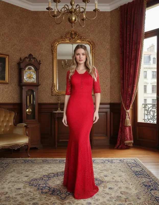 A renda em tons clássicos e vibrantes permite que o vestido seja usado tanto em eventos diurnos ao ar livre, quanto em festas noturnas mais formais e sofisticadas.