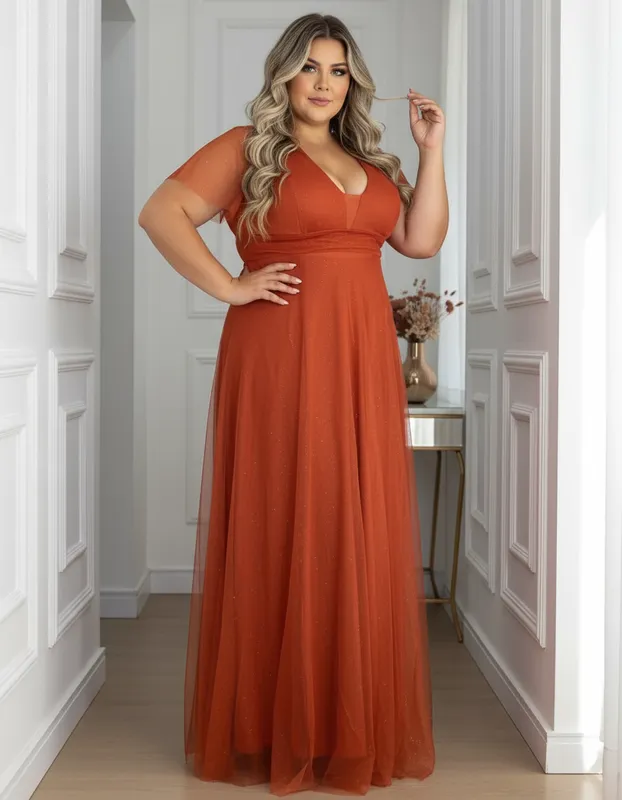 Sinta-se elegante e confiante em qualquer evento com este vestido longo de festa plus size. Com delicados brilhos que adicionam sofisticação, ele possui forro interno, garantindo conforto e liberdade de movimento. Perfeito para casamentos, formaturas, festas e ocasiões especiais.