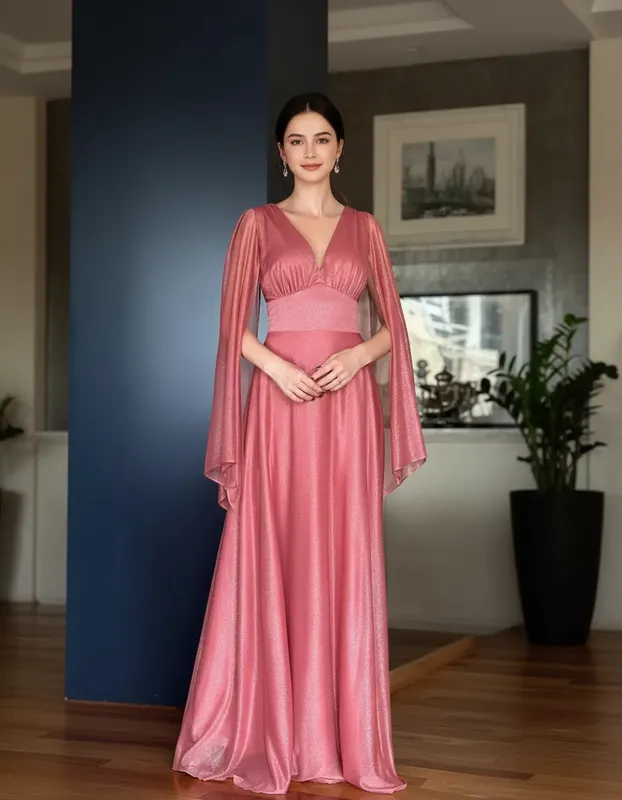 Vestido de Festa Rosa Brilhante Mangas Fluidas