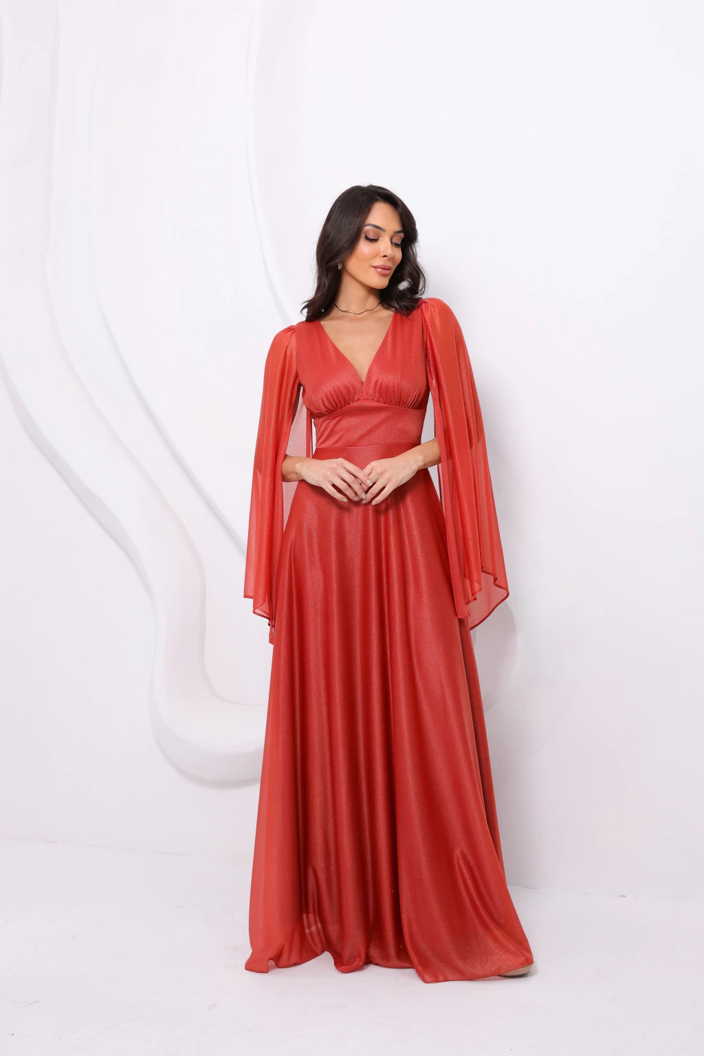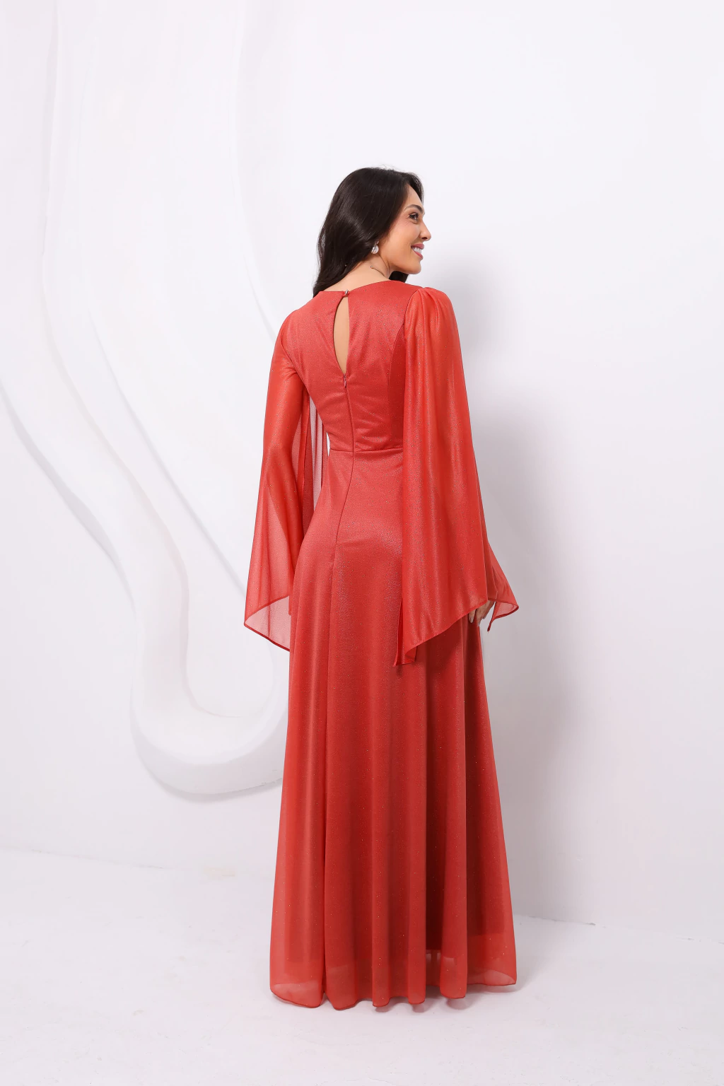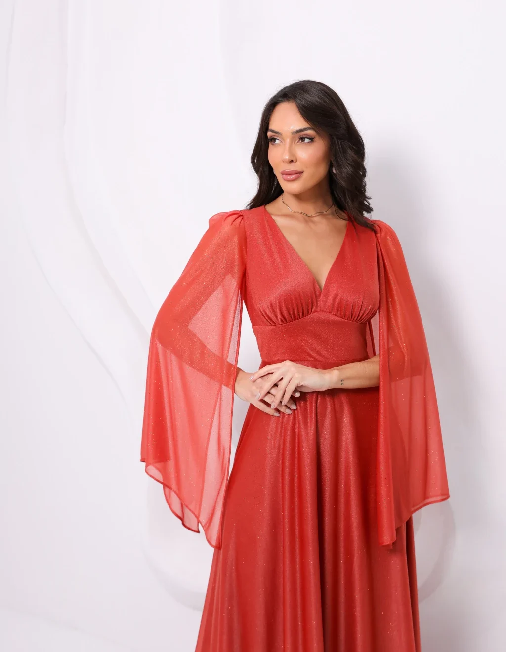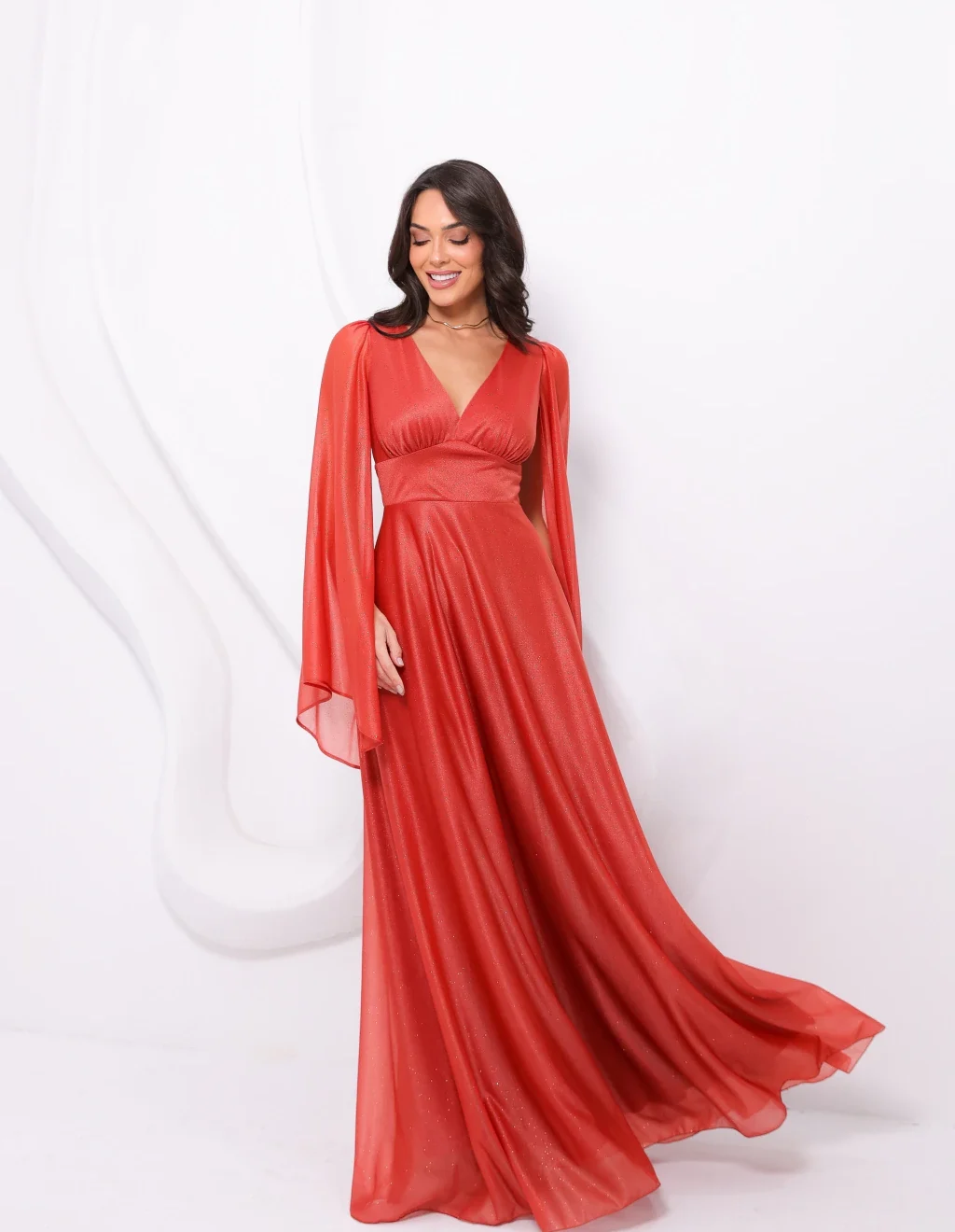 Os vestidos longos com manga longa capa são versáteis, delicados e cheios de charme. Um modelo perfeito para quem busca elegância com brilho e movimento. Ideal para eventos sofisticados, especialmente no fim da tarde.