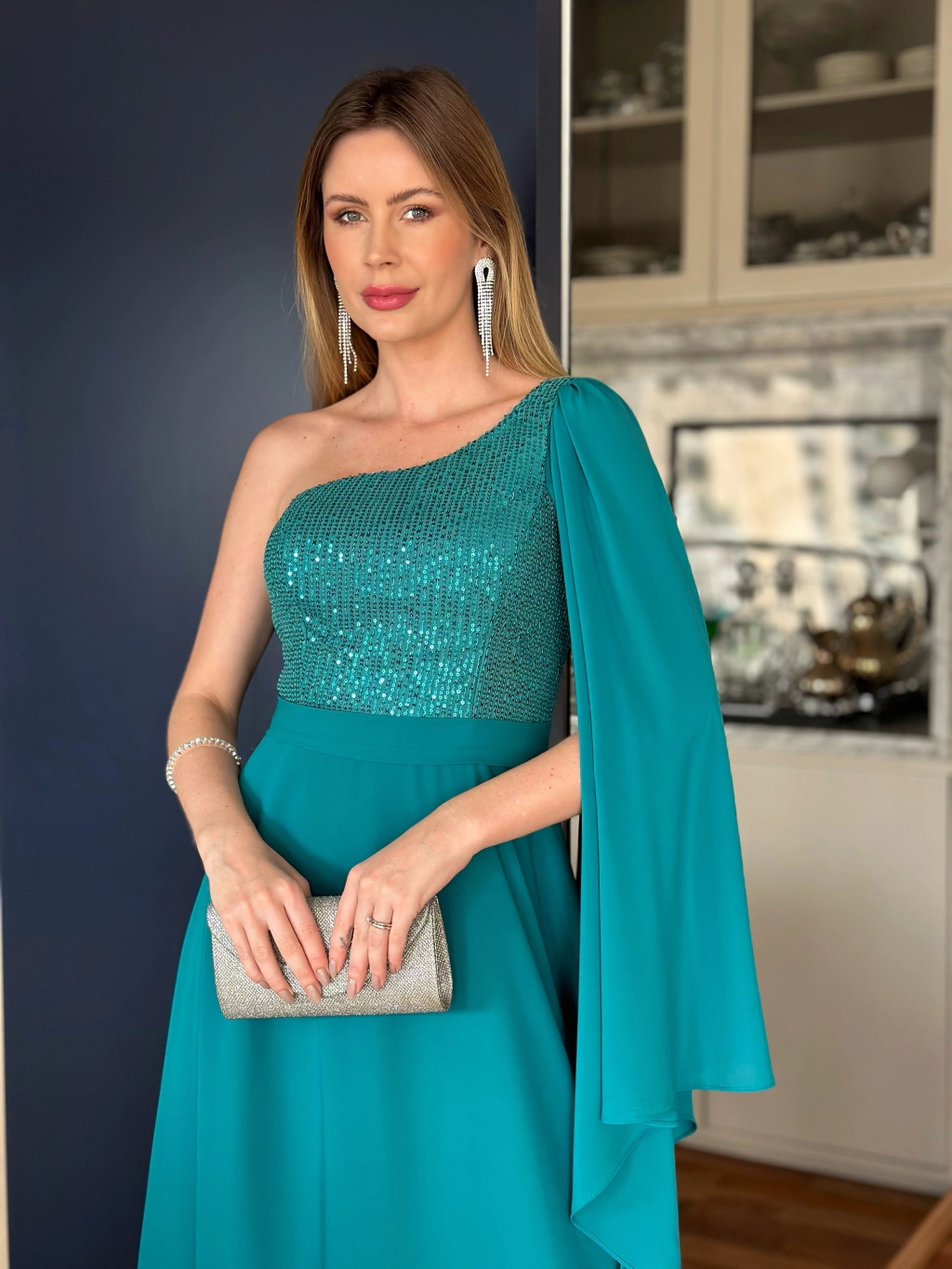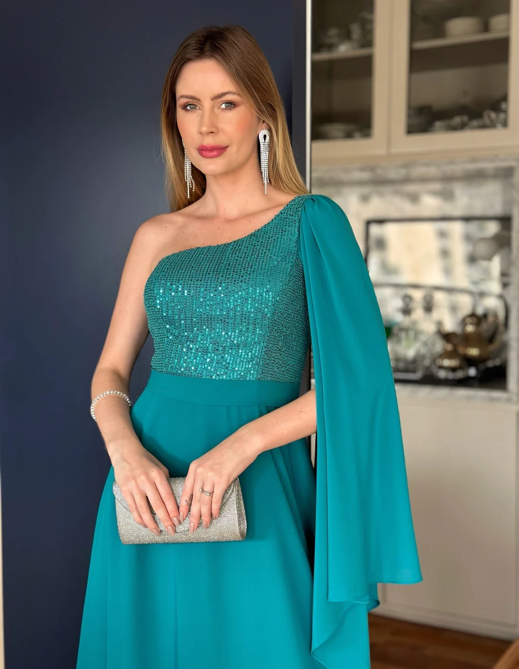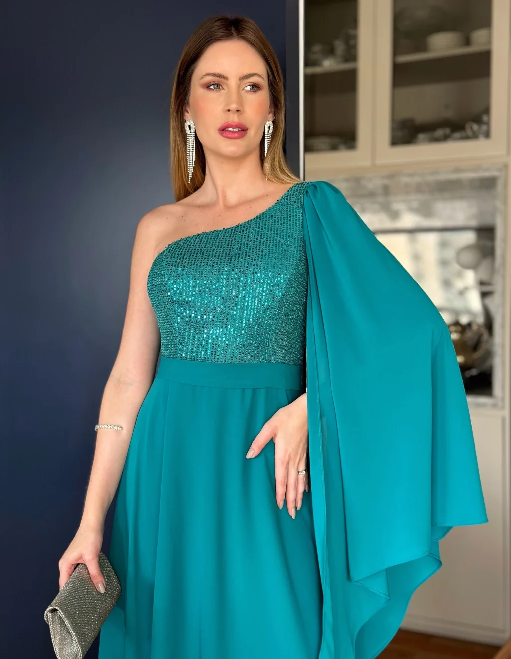 O destaque fica para a manga capa em um ombro só, que entrega um visual único, moderno e glamouroso. O bojo estruturado melhora o caimento no busto, enquanto o cinto embutido em crepe salina valoriza a cintura e alonga a silhueta, deixando o look ainda mais harmônico.