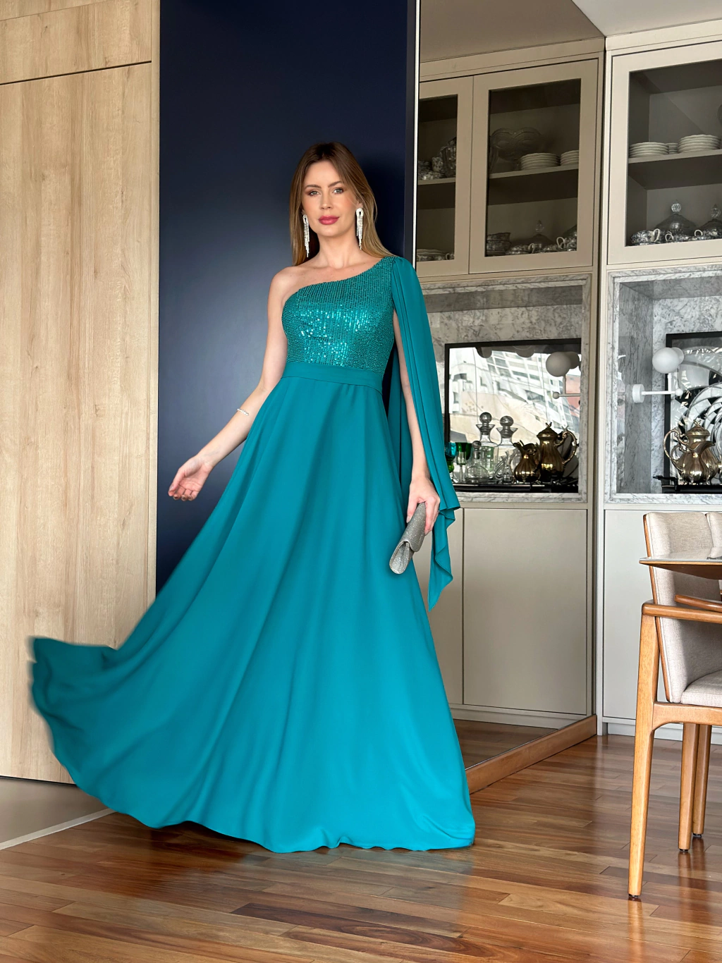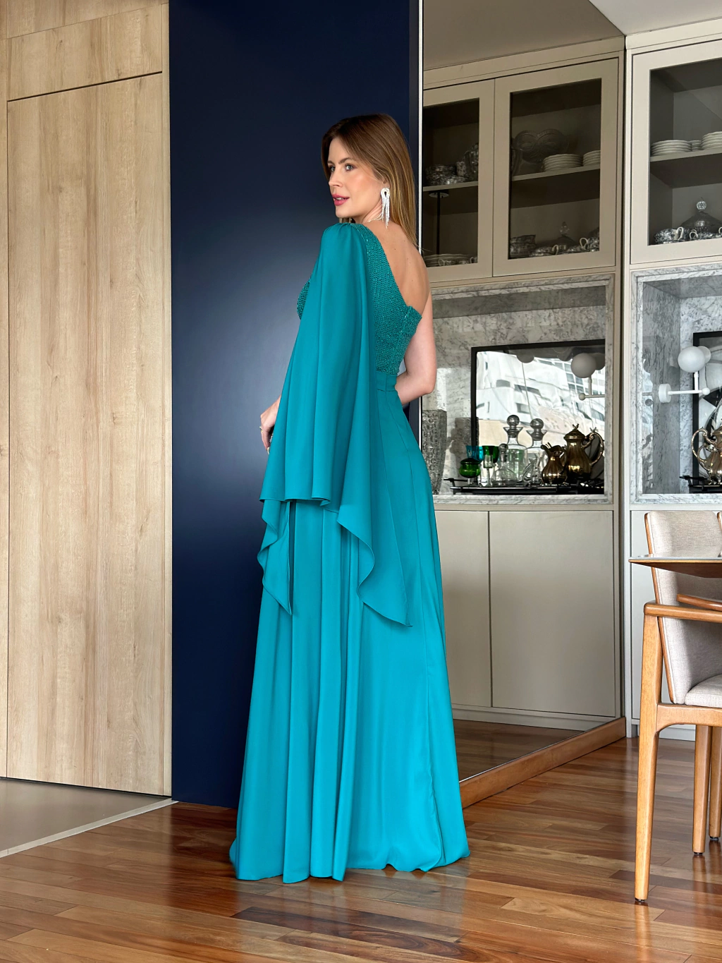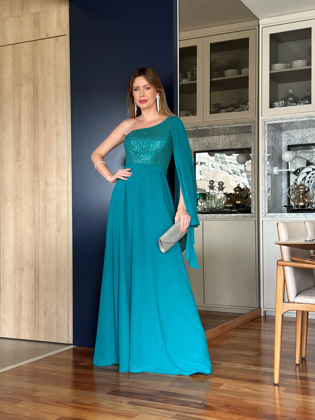 O destaque fica para a manga capa em um ombro só, que entrega um visual único, moderno e glamouroso. O bojo estruturado melhora o caimento no busto, enquanto o cinto embutido em crepe salina valoriza a cintura e alonga a silhueta, deixando o look ainda mais harmônico.