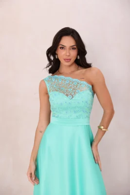 Vestido longo de festa com corpo em tule bordado, trazendo textura e brilho na medida certa.