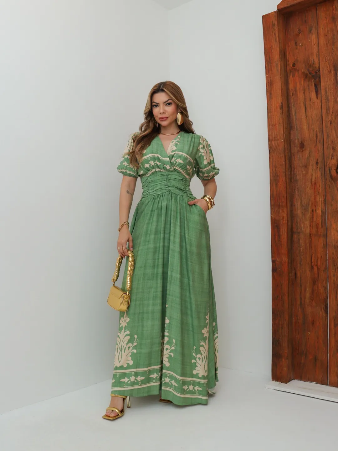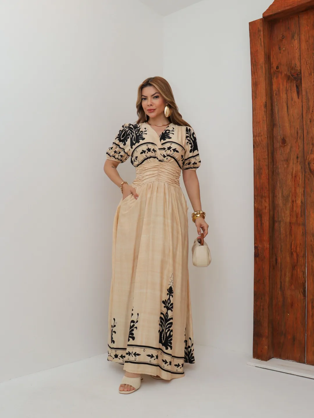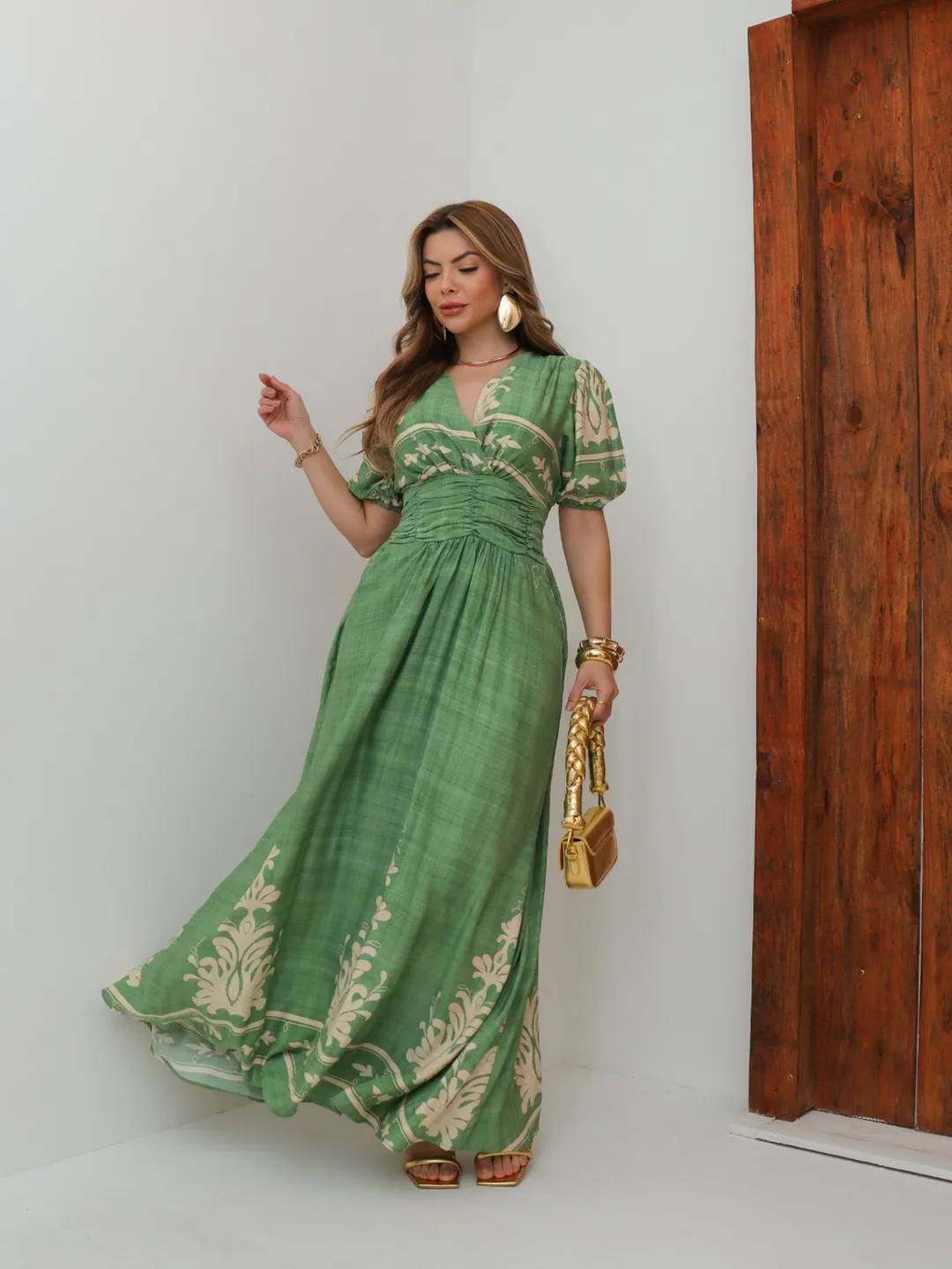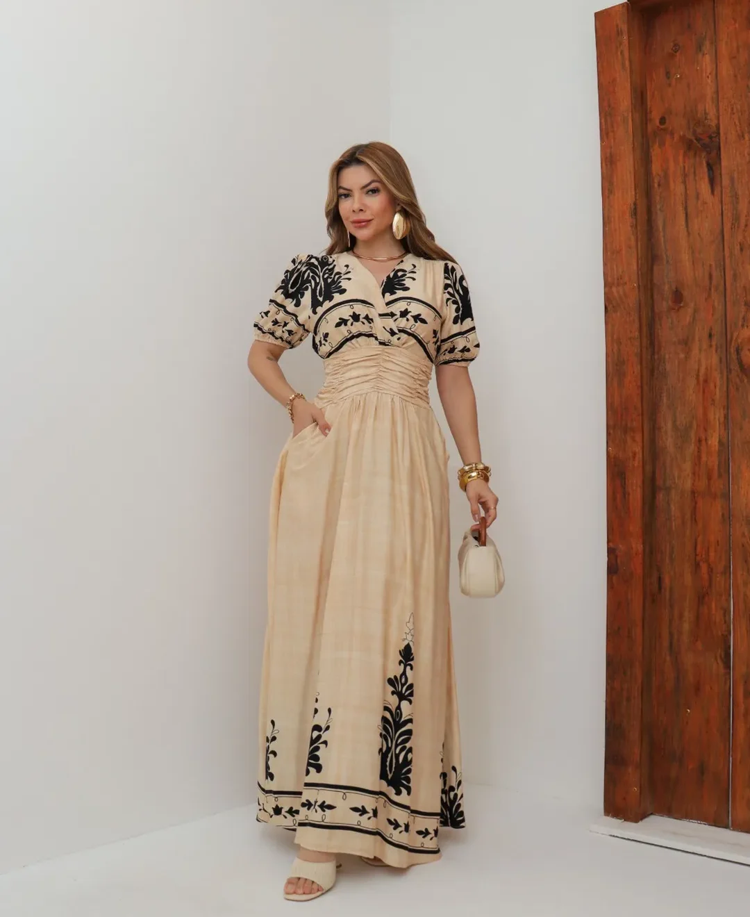 Vestido La Bohème – Elegância Longa com Drapeado e Estampa Exclusiva