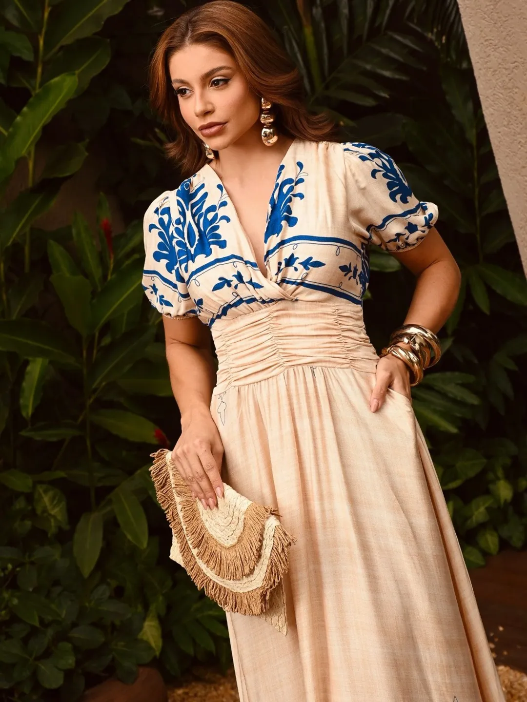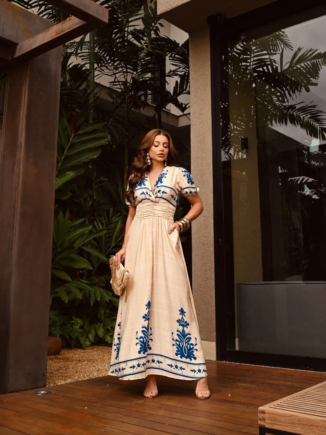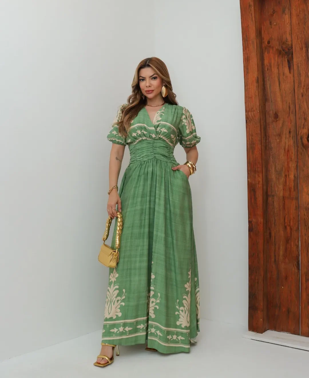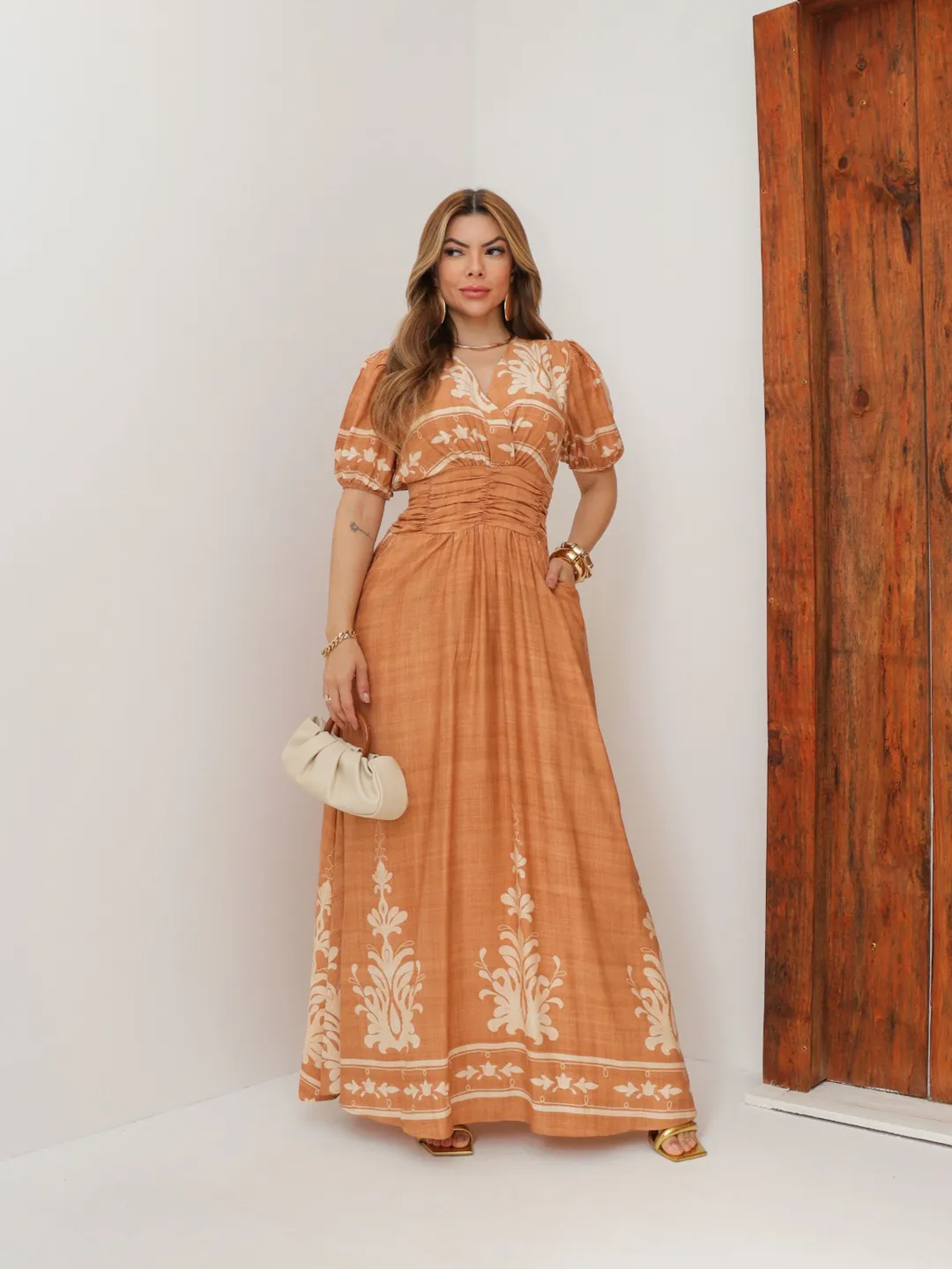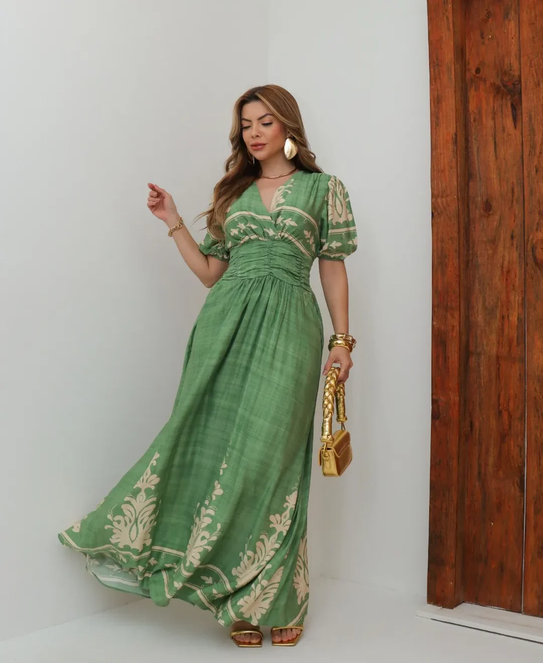 Vestido La Bohème – Elegância Longa com Drapeado e Estampa Exclusiva