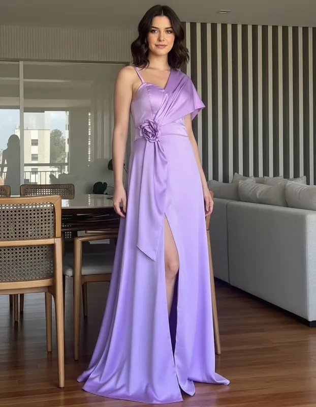 Vestido de Festa em Crepe Satin Lilás com Fenda e Detalhe Floral – Ideal para Madrinhas, Mães de Noiva e Formandas