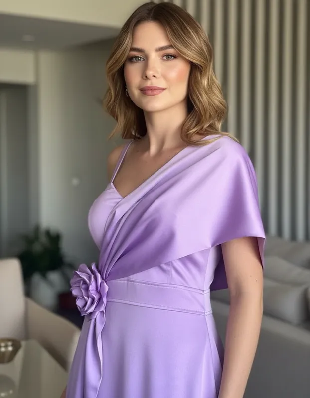 O vestido em crepe satin lilás é uma peça de alta sofisticação, confeccionada em um tecido leve, brilhante e elegante. Seu caimento impecável valoriza a silhueta, trazendo glamour e delicadeza ao look. É uma opção versátil para madrinhas de casamento, mães de noiva/noivo, formandas e convidadas de eventos especiais.