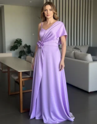 Vestido de Festa em Crepe Satin Lilás com Fenda e Detalhe Floral – Ideal para Madrinhas, Mães de Noiva e Formandas