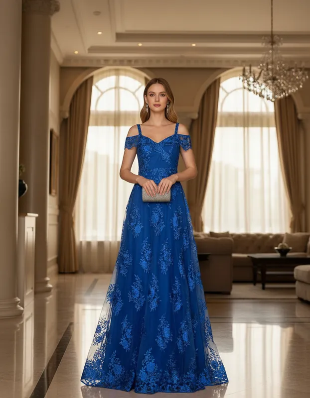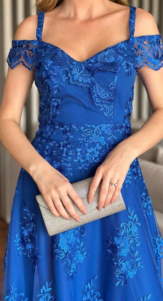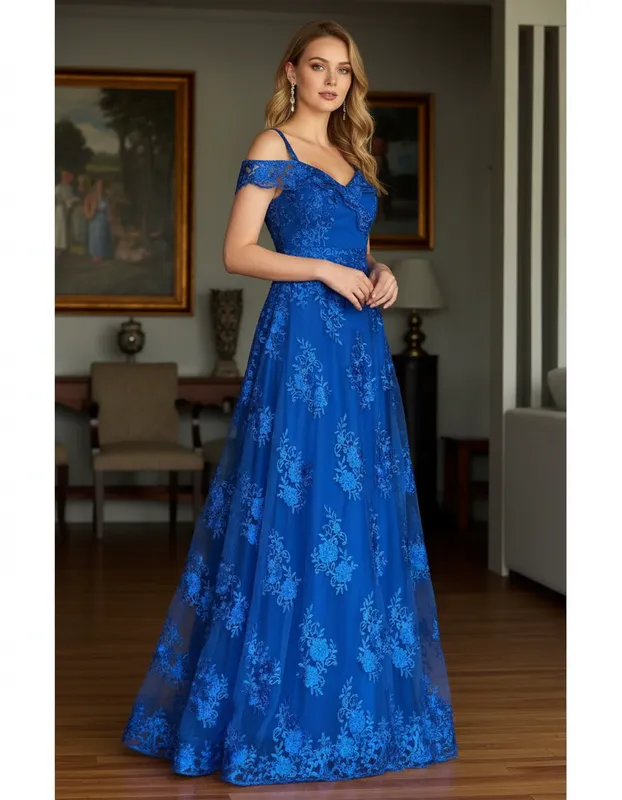Vestido Longo Azul Royal em Tule de Festa para Madrinhas Mãe do Noivo