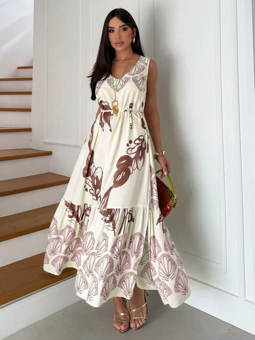 Este vestido longo possui forro interno, cinto para ajustar a cintura e uma fenda lateral que adiciona um toque moderno e elegante. Com estampa de folhas, é ideal para eventos, passeios, festas ou ocasiões casuais com charme.