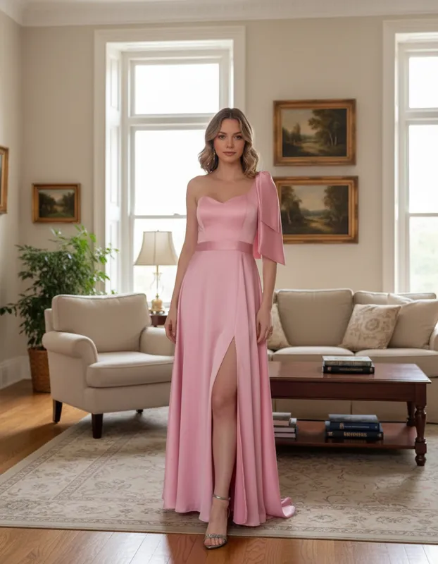 Modelagem longa com alça única (um ombro só) e detalhe de laço no ombro.