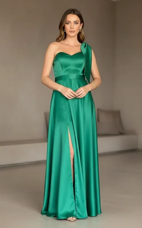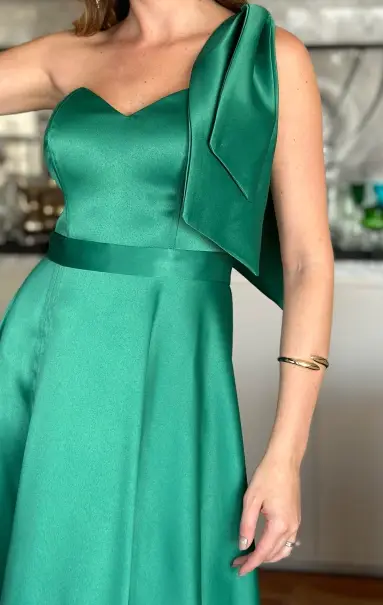 Modelagem longa com alça única (um ombro só) e detalhe de laço no ombro.