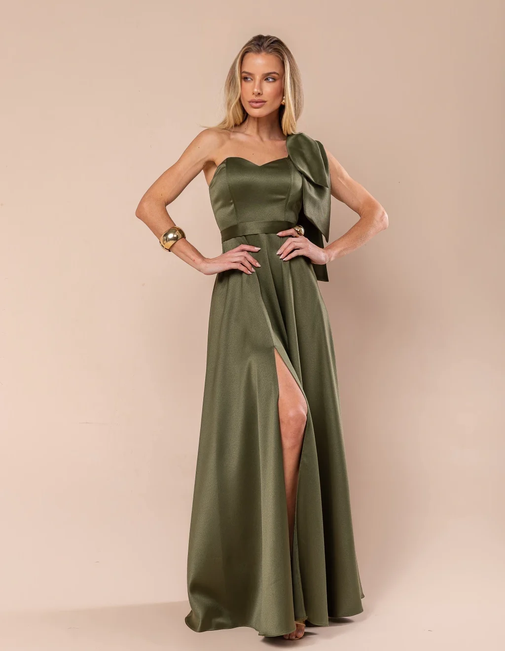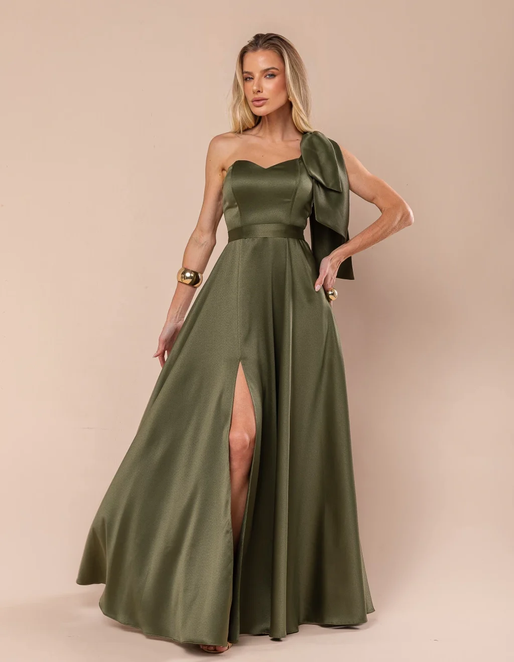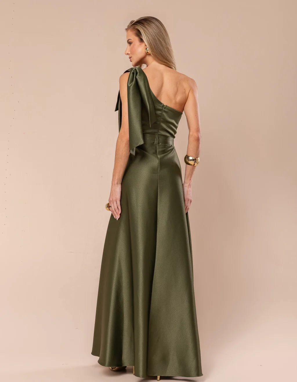 Modelagem longa com alça única (um ombro só) e detalhe de laço no ombro.