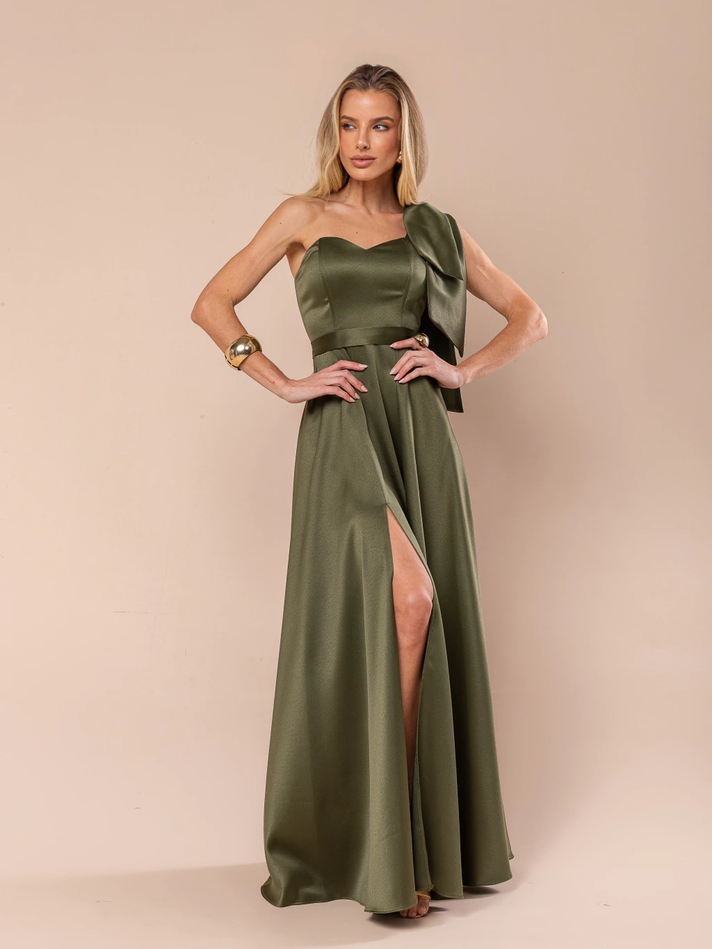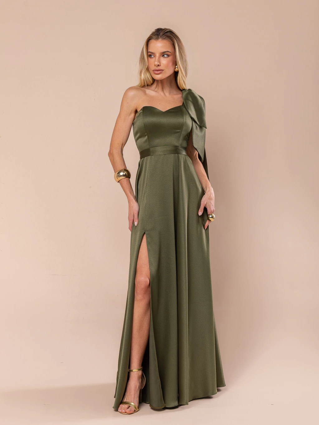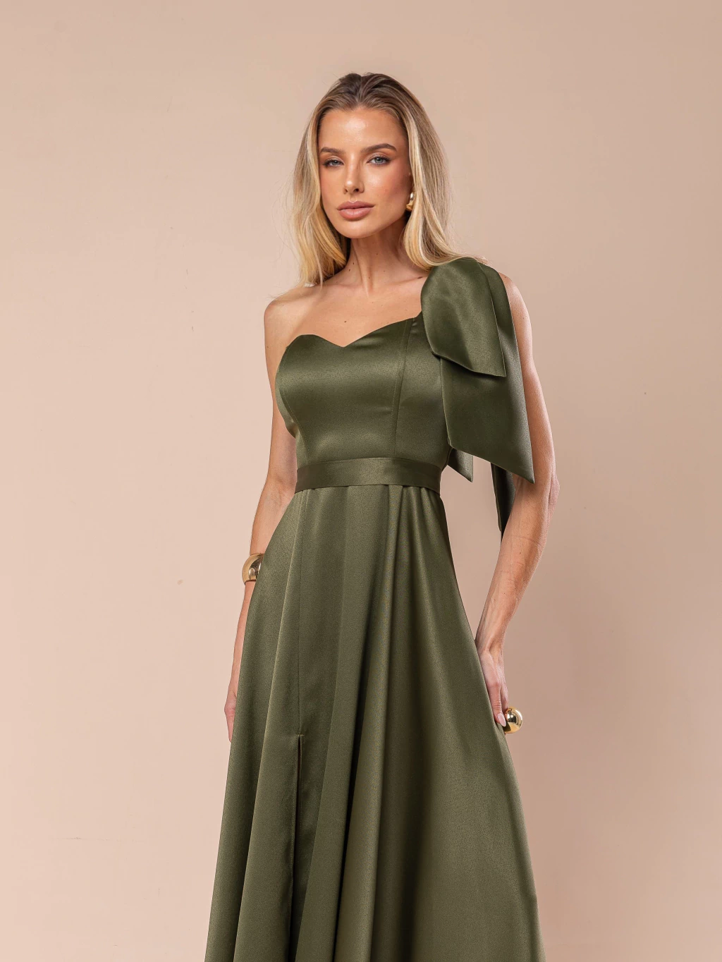 Modelagem longa com alça única (um ombro só) e detalhe de laço no ombro.