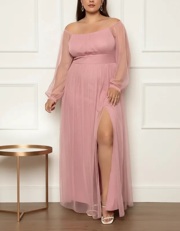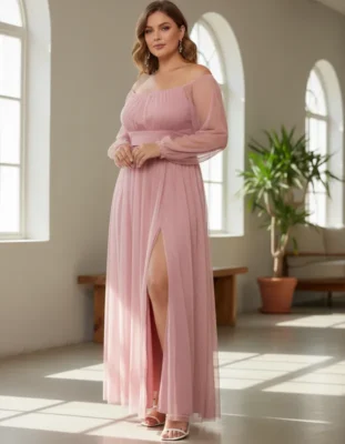 O vestido possui mangas longas transparentes, decote reto moderno e uma fenda sutil que adiciona charme e movimento ao visual.