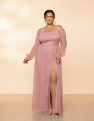 O vestido possui mangas longas transparentes, decote reto moderno e uma fenda sutil que adiciona charme e movimento ao visual.