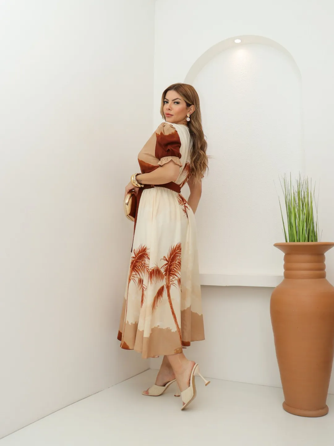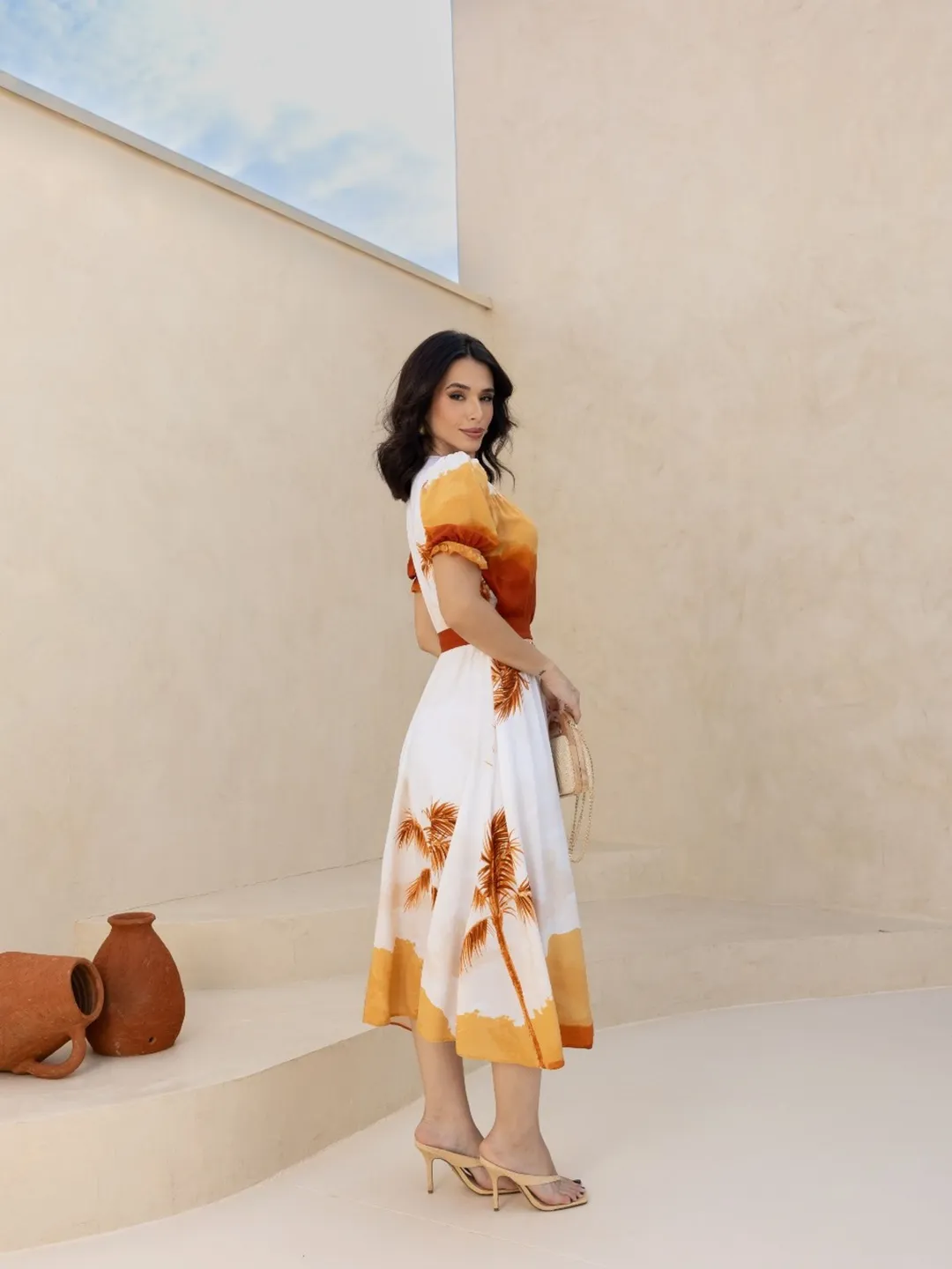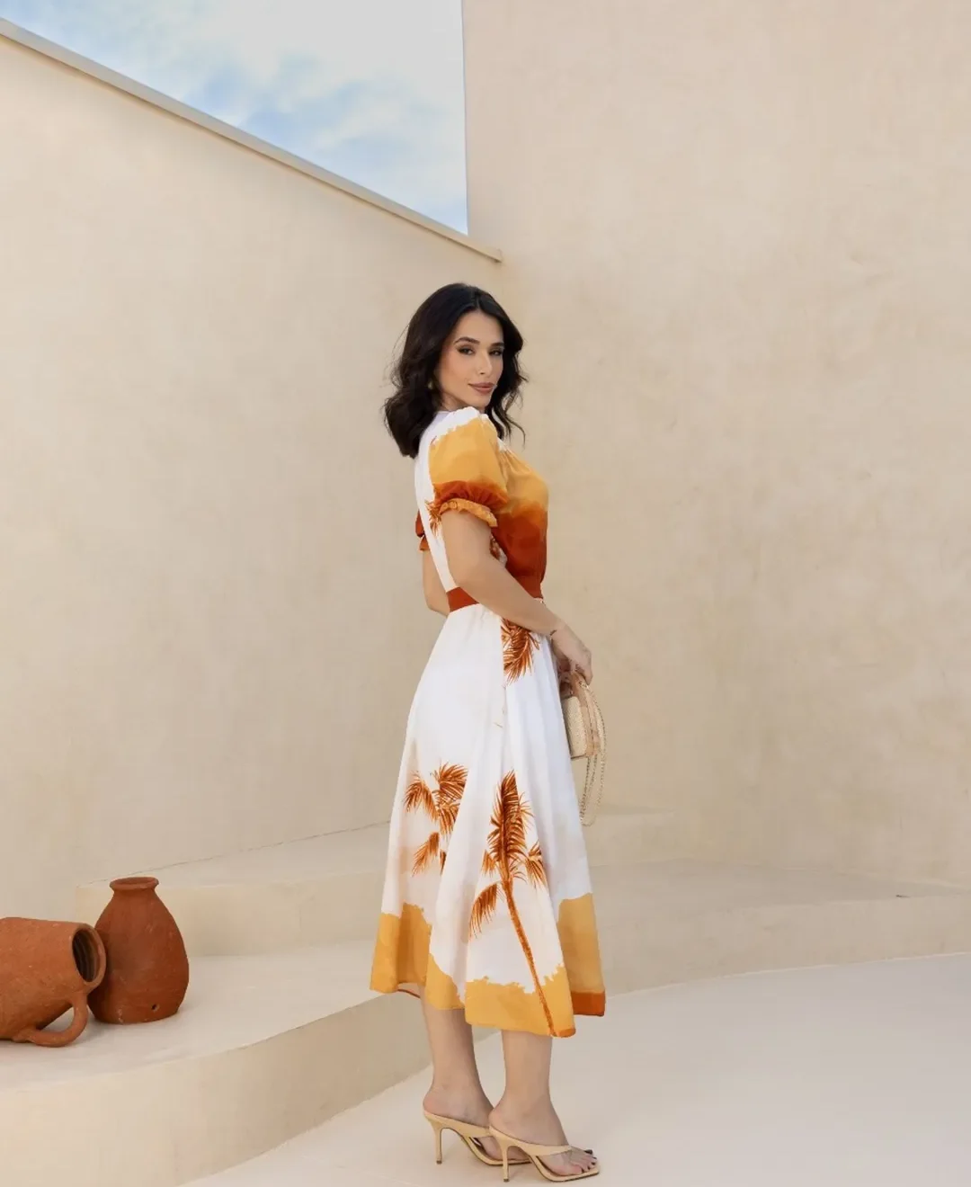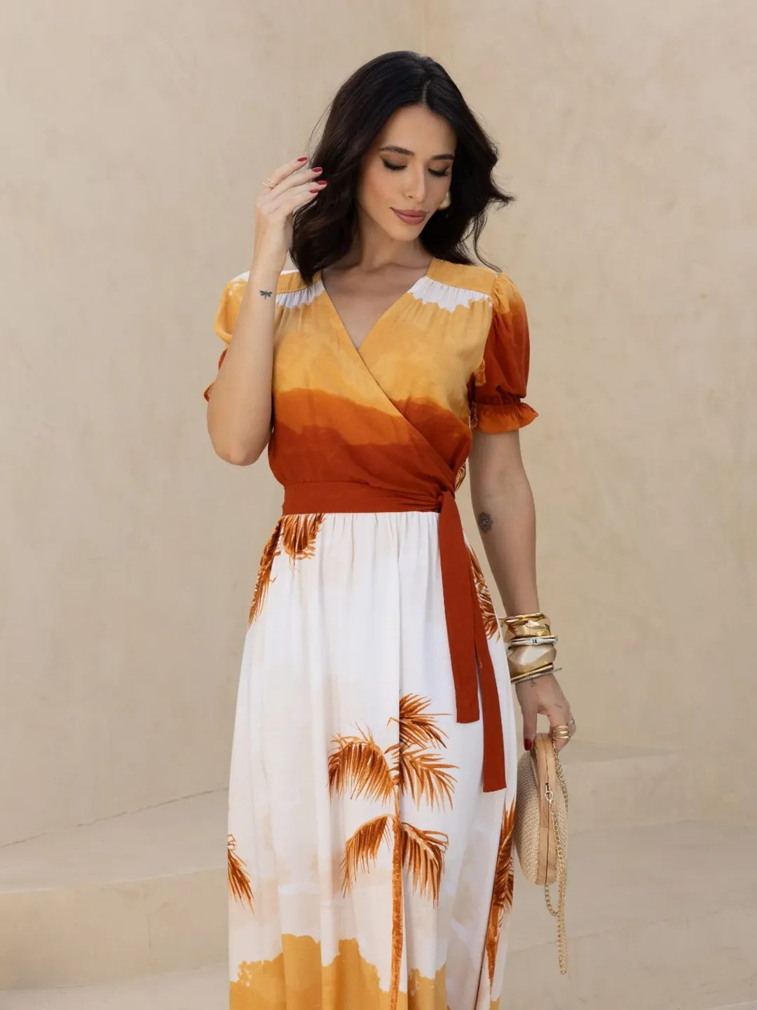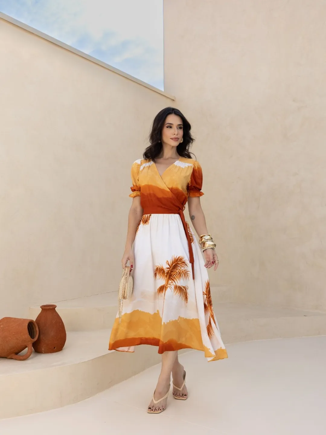 A estampa em tons terrosos, com paisagens tropicais, traz leveza e um ar sofisticado, tornando o Vestido Savina Studio uma escolha versátil e atemporal.