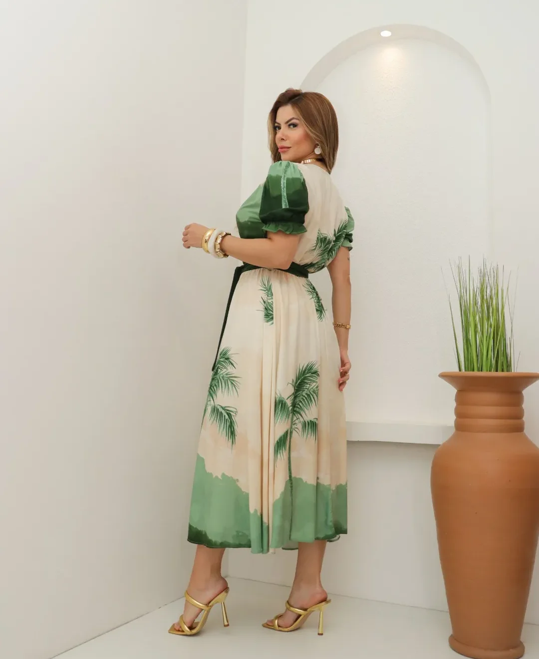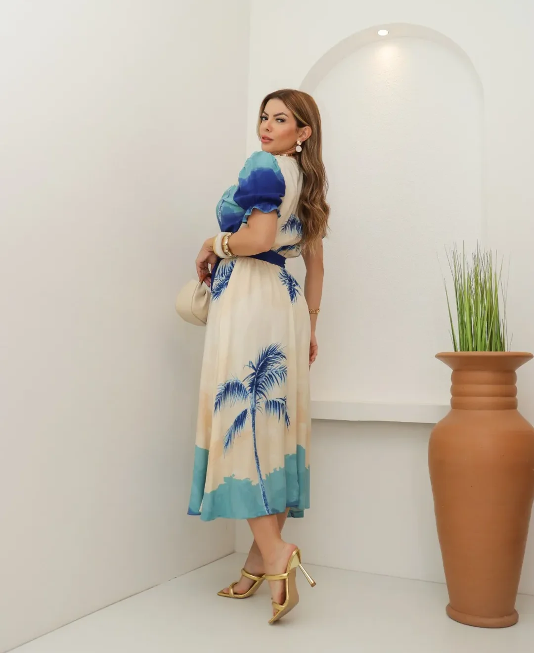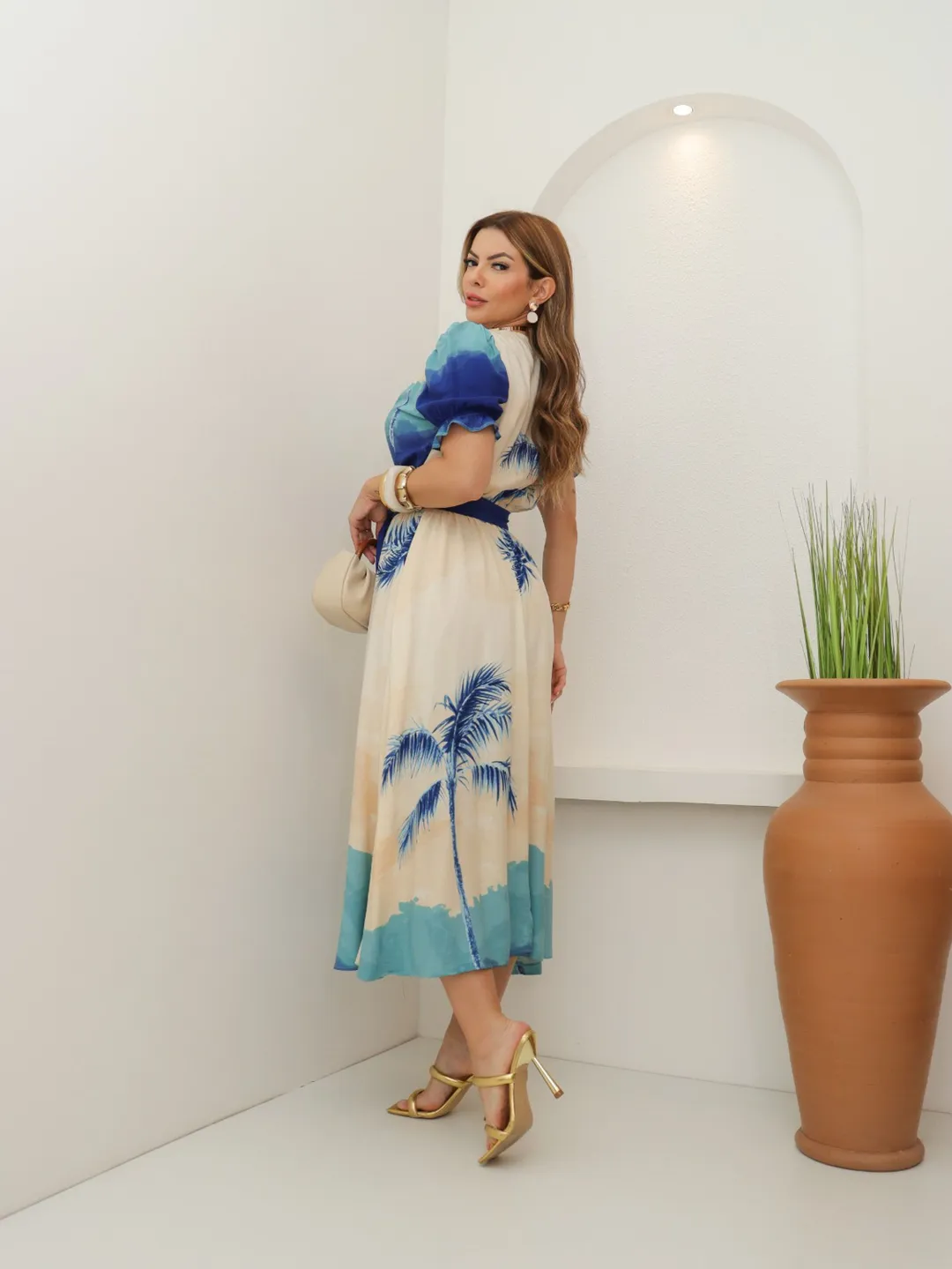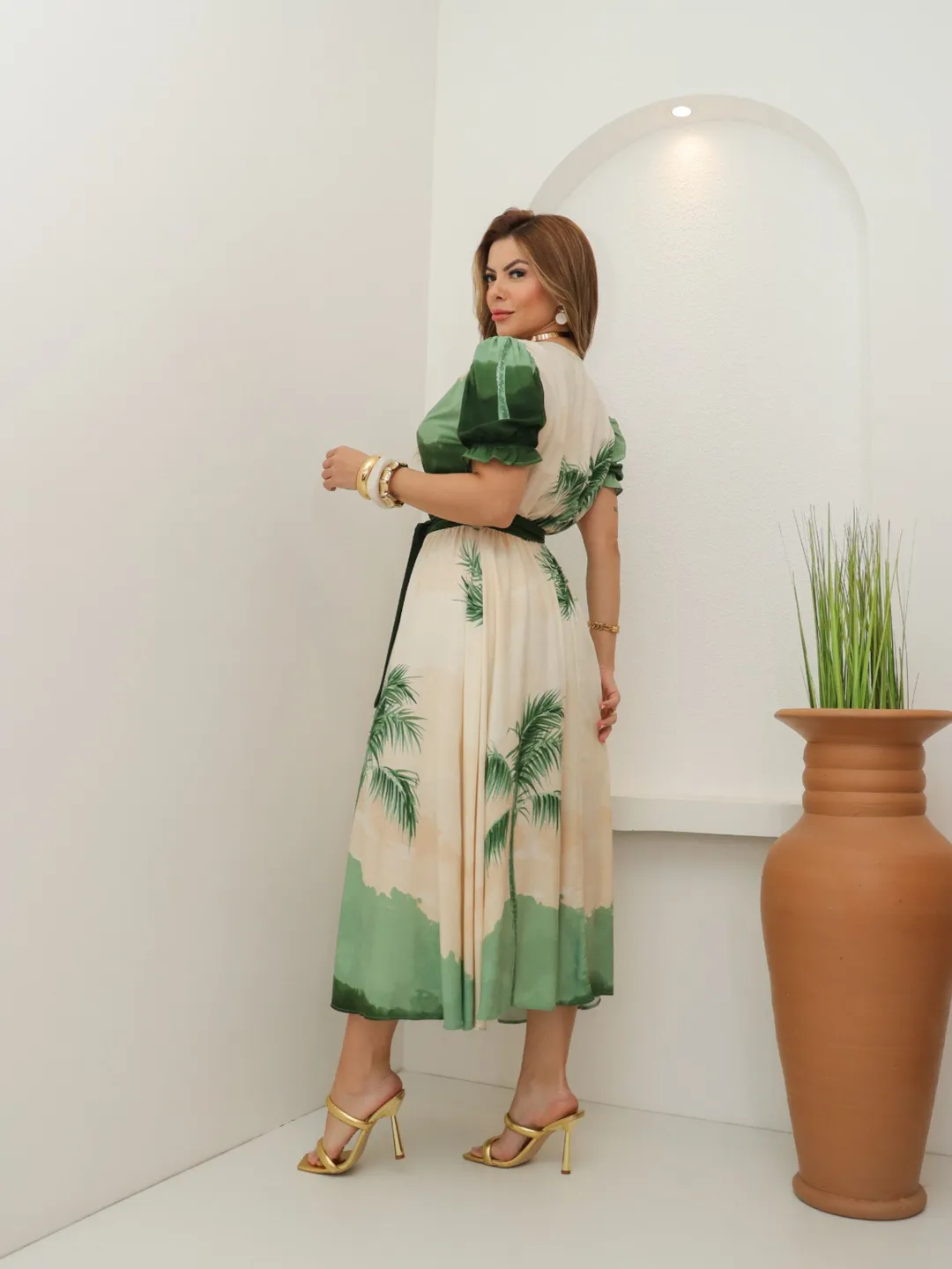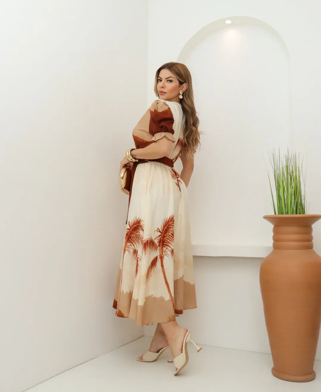 A estampa em tons terrosos, com paisagens tropicais, traz leveza e um ar sofisticado, tornando o Vestido Savina Studio uma escolha versátil e atemporal.