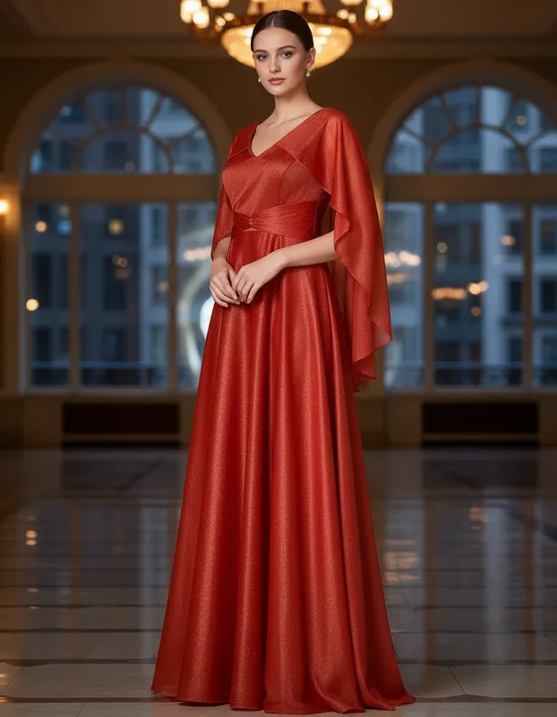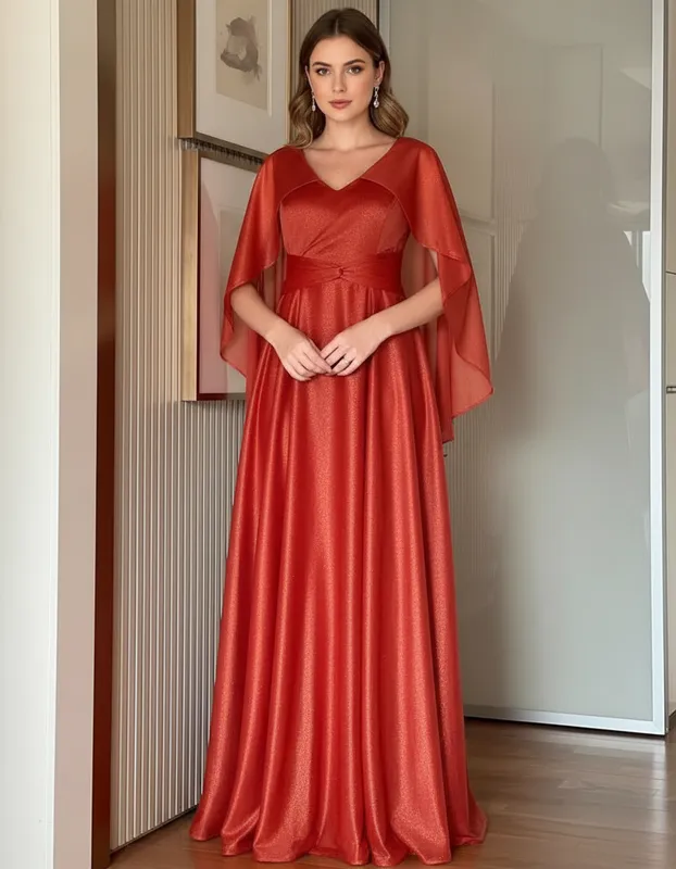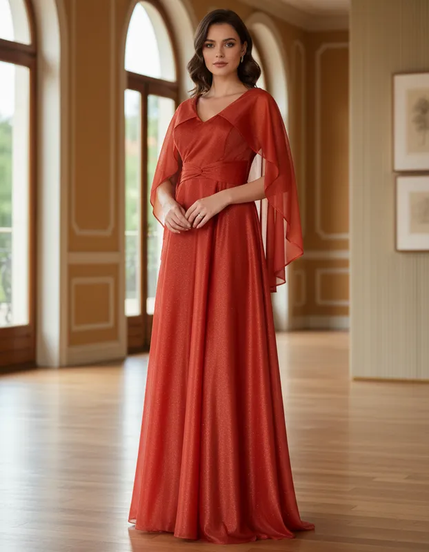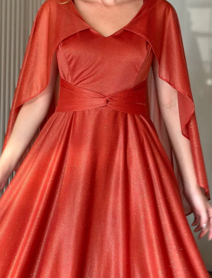 Vestido Longo Terracota com Brilho e Mangas Estilo Capa – Elegância com Fluidez